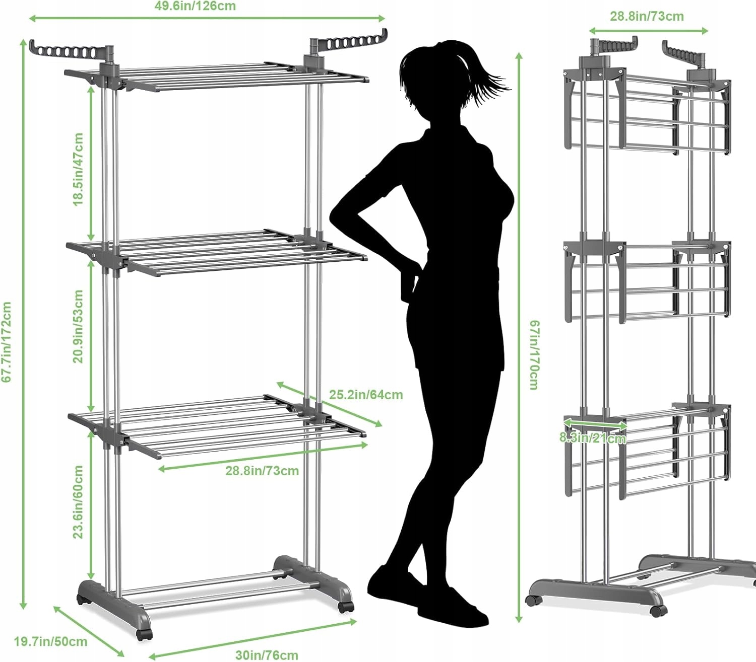 - 4-уровневая сушильная поверхность: 6 выдвижных лотков и 2 боковые створки для проветривания полотенец, носков, футболок, свитеров, шапок, пальто, костюмов, платьев, обуви и т. д. Каждую сушилку можно сложить для экономии места, сушить одежду можно на нескольких направляющих, 7 крючков на 2 боковых крыльях для дополнительной сушки.