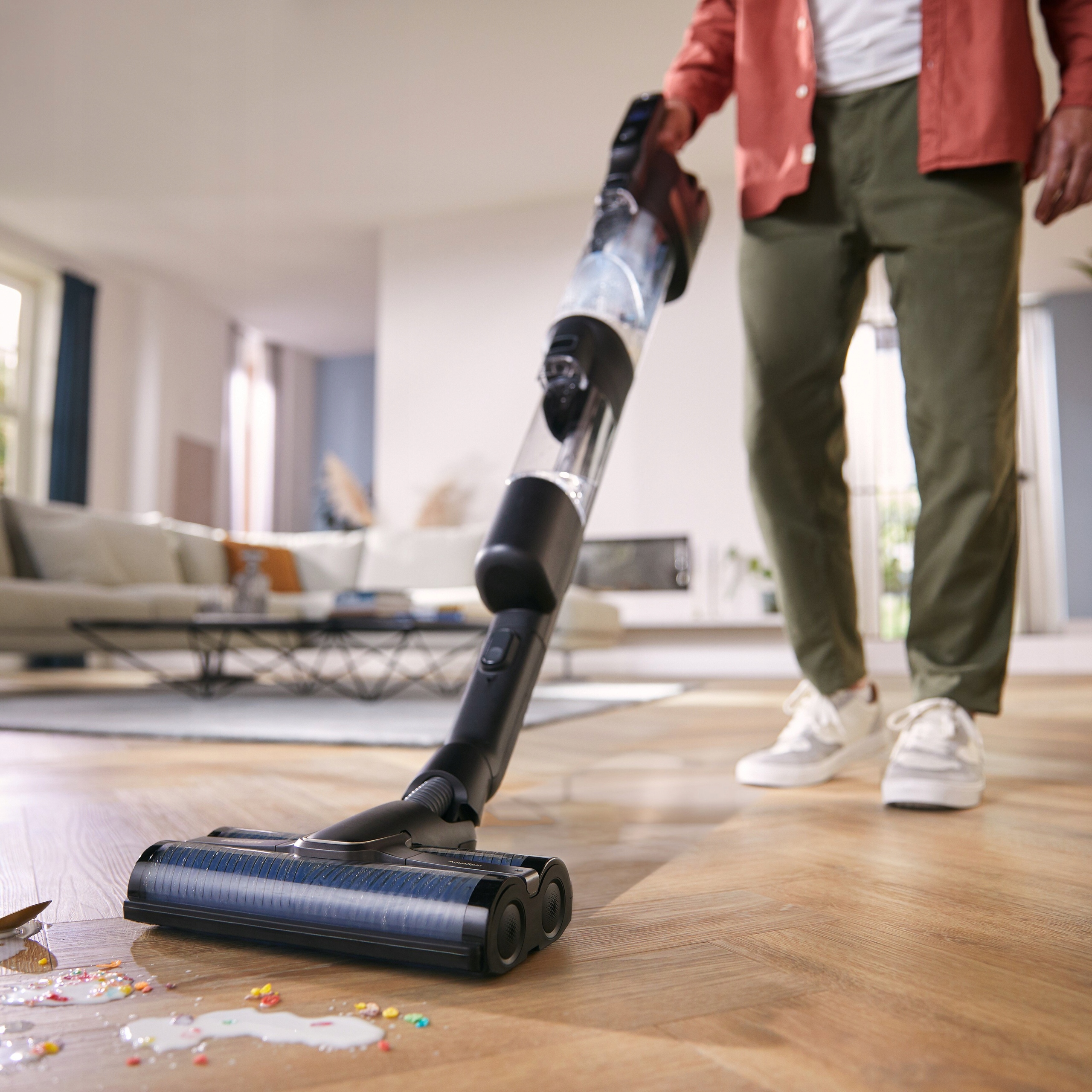 - 3 в 1 — единственное решение на рынке, объединяющее 3 устройства: беспроводной пылесос с активной уборкой функциональный беспроводной пылесос со светодиодной подсветкой и съемным ручным пылесосом.