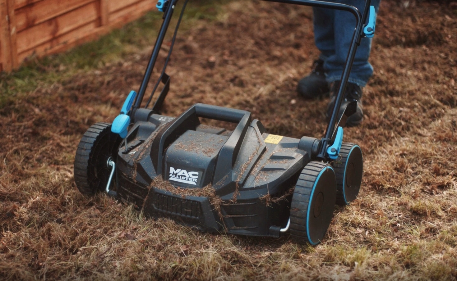 Agracter Aerator Aerator является эффективным устройством, 1800 Вт и рабочей шириной 37 см. Емкость электрической вертикальной корзины составляет 45 литров.