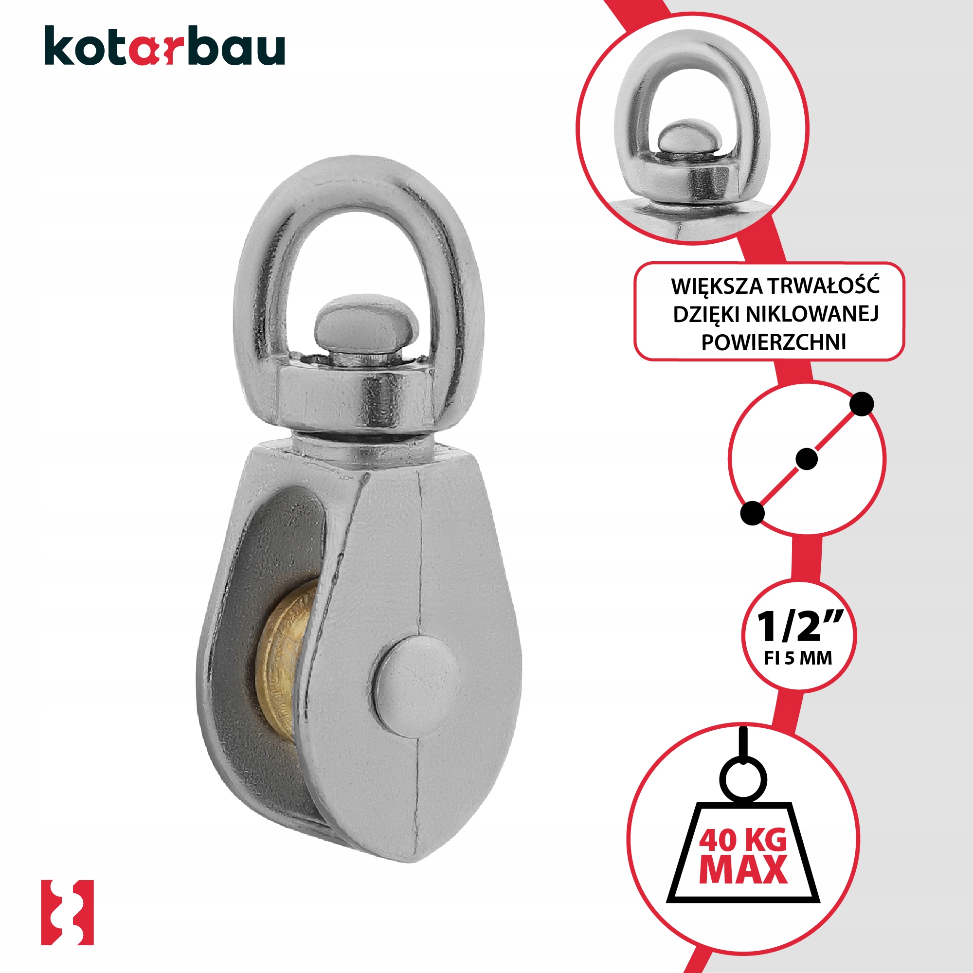 - Благодаря использованию никелированного стального кольца и поворотной проушины веревочный блок позволяет веревке двигаться плавно, без лишнего трения.