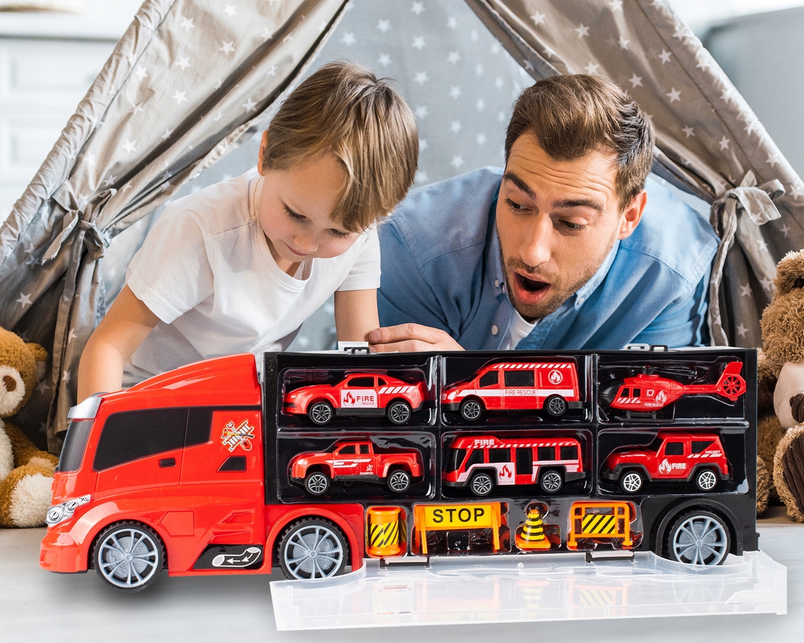 У грузовика есть выдвижная ручка, облегчающая передачу игрушки, и благодаря тому факту, что автомобиль скрыт в ней, вы можете сэкономить пространство и в то же время отображать транспортные средства через прозрачное пластиковое стекло.