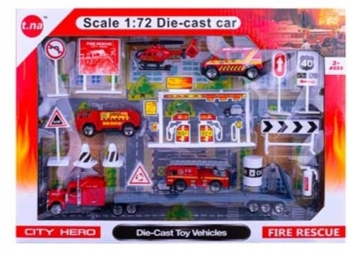 В этом сете есть вертолет. Три пожарных, Кужароука, а также дорожные знаки и заправочная станция.