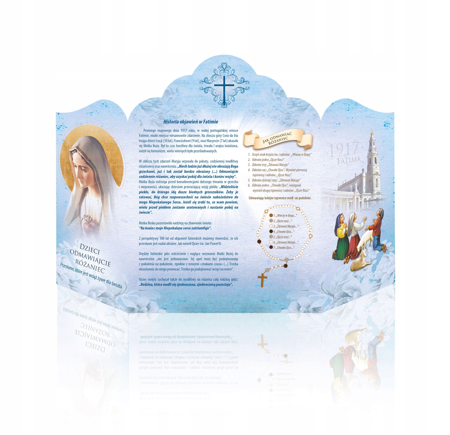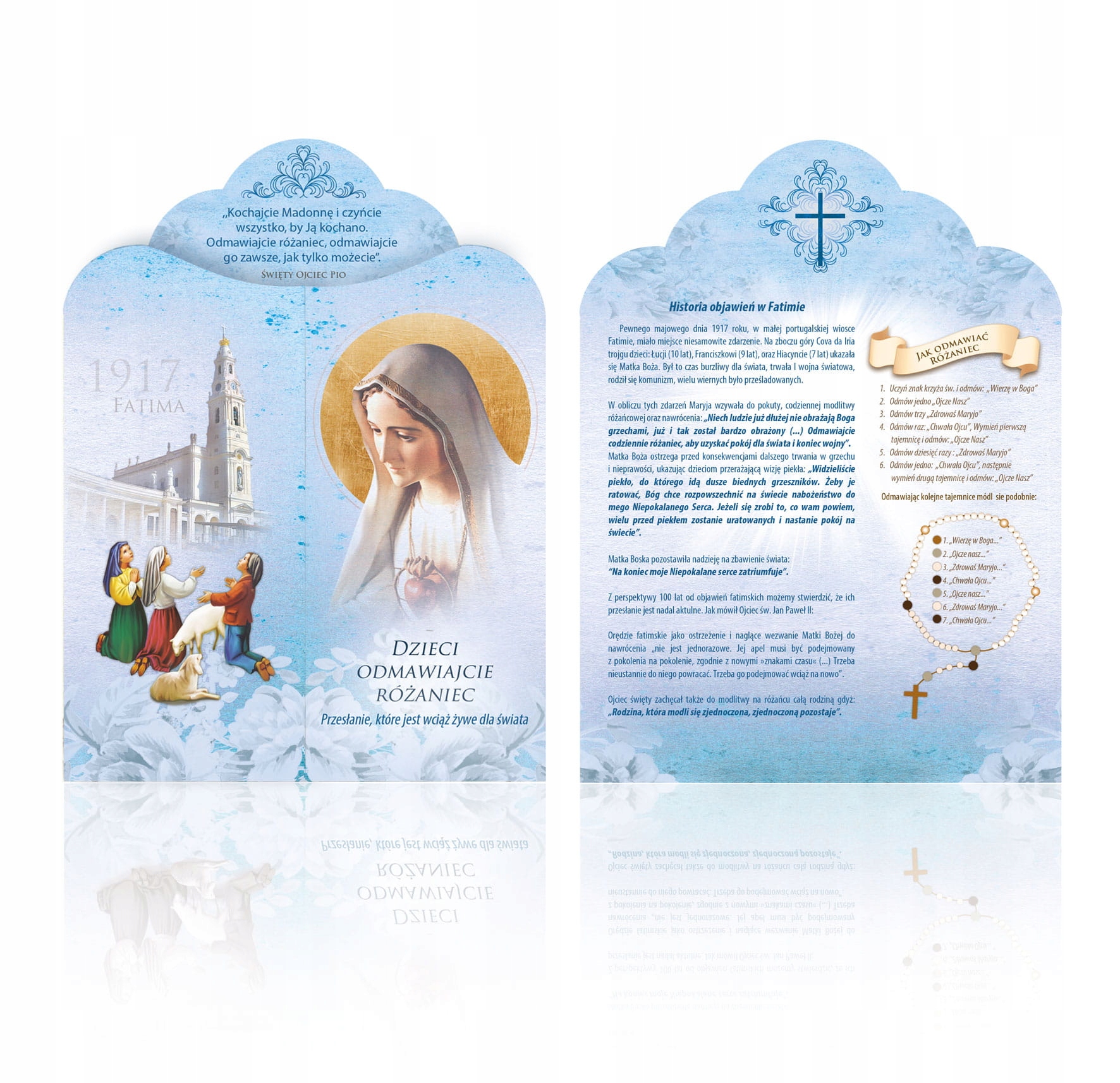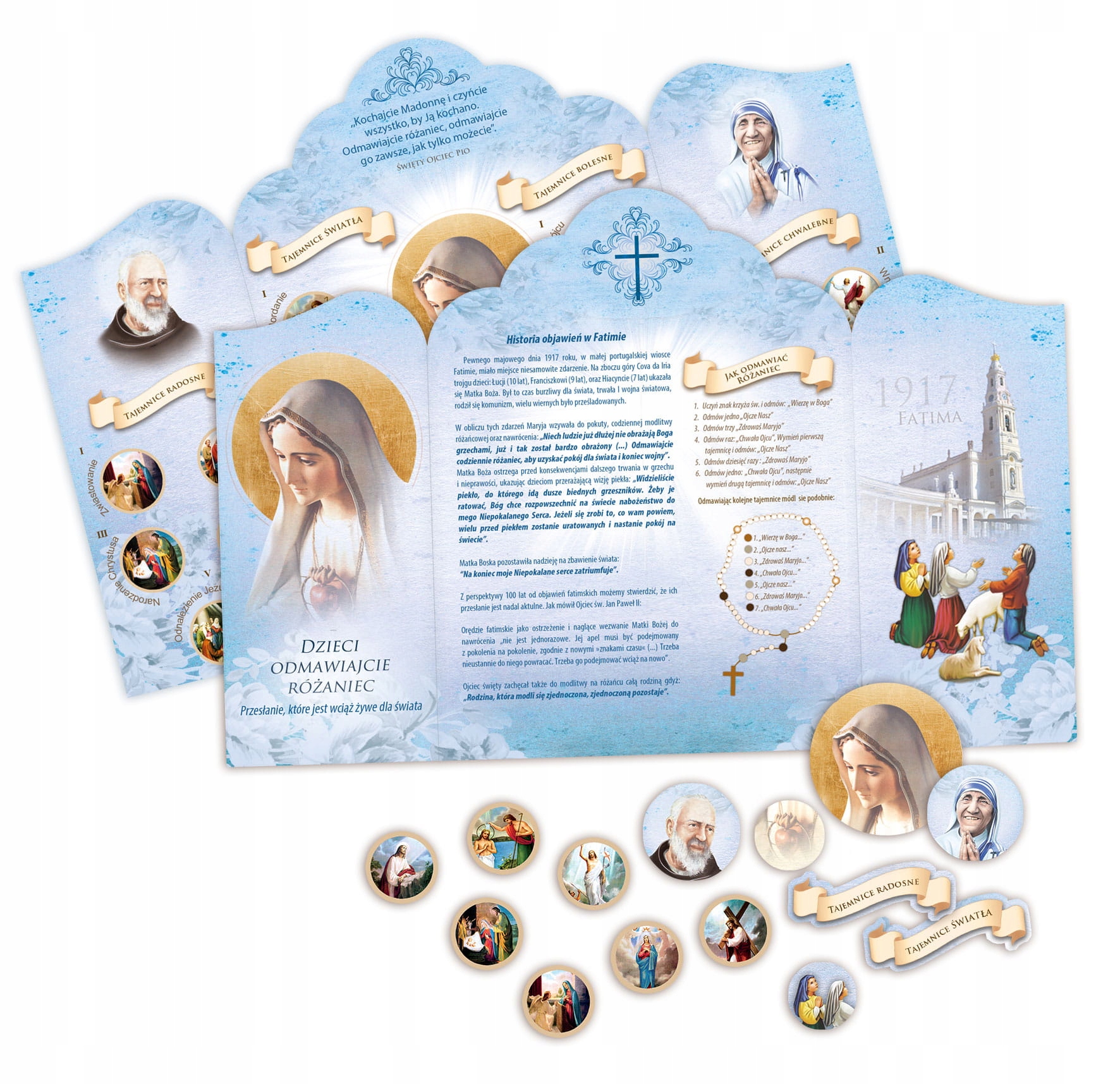 Чётки в виде сложенной книги содержат историю явлений Пресвятой Девы Марии в Фатиме и инструкции, как молиться четками. Красивые, вырезанные сцены, изображающие радостные, светлые, болезненные и славные тайны, позволяют активно создавать четки. Кроме того, в книге фигурируют две очень важные личности — святой падре Пио и святая мать Тереза Калькуттская.