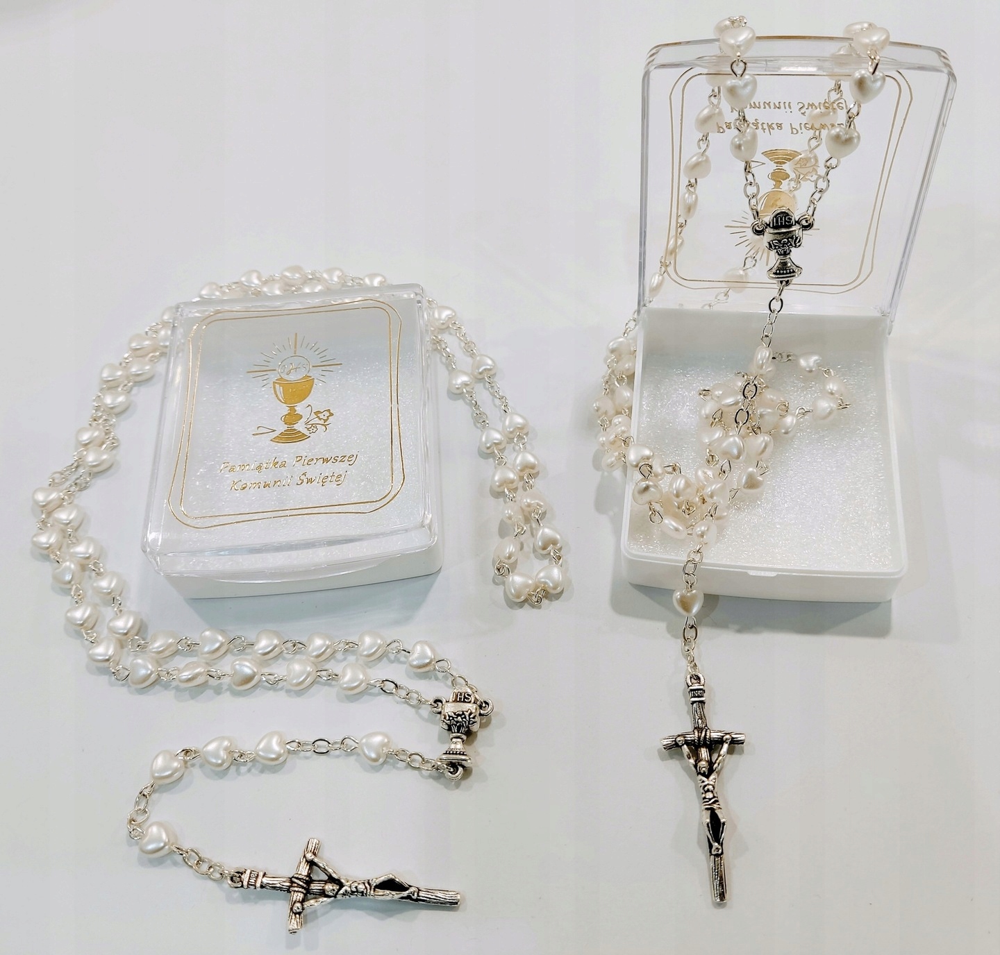 Четки для причастия для девочки или мальчика, изготовленные из жемчужных бусин в форме сердечек. Имеет красивое мерцающее покрытие. Крест и чаша IHS выполнены из металла, отличающегося исключительным вниманием к деталям.