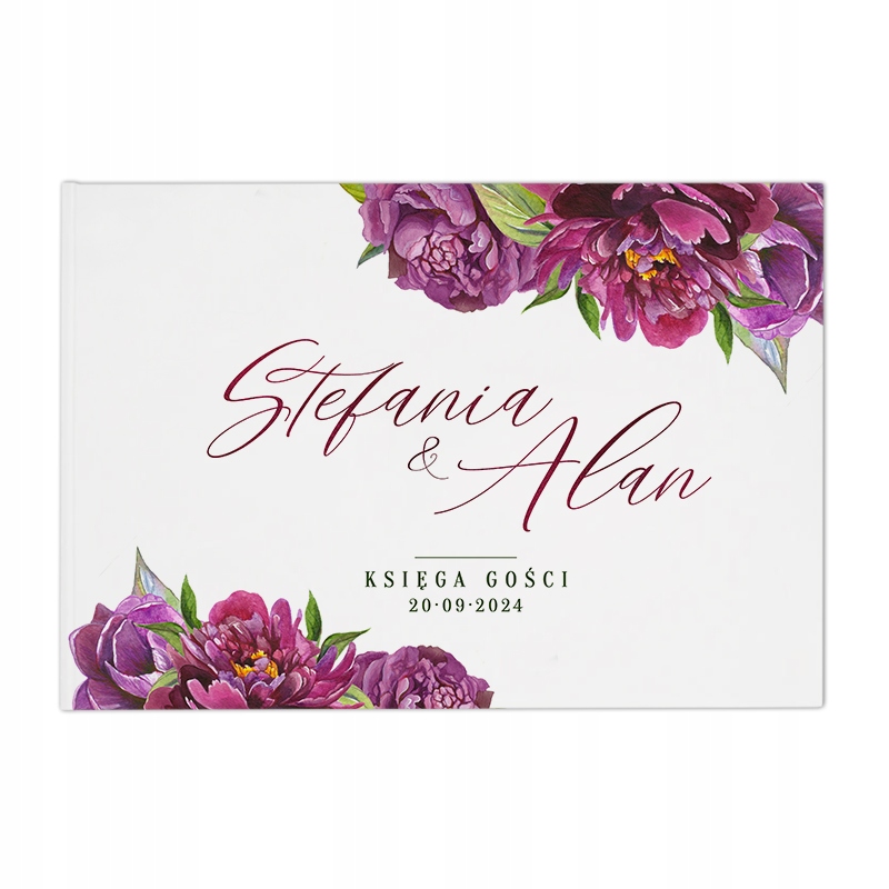 Книга украшена цветочным узором, добавляющим очарования, а также именами влюбленных и датой торжества. Внутри книги все открытки пустые и доступны в белом цвете.