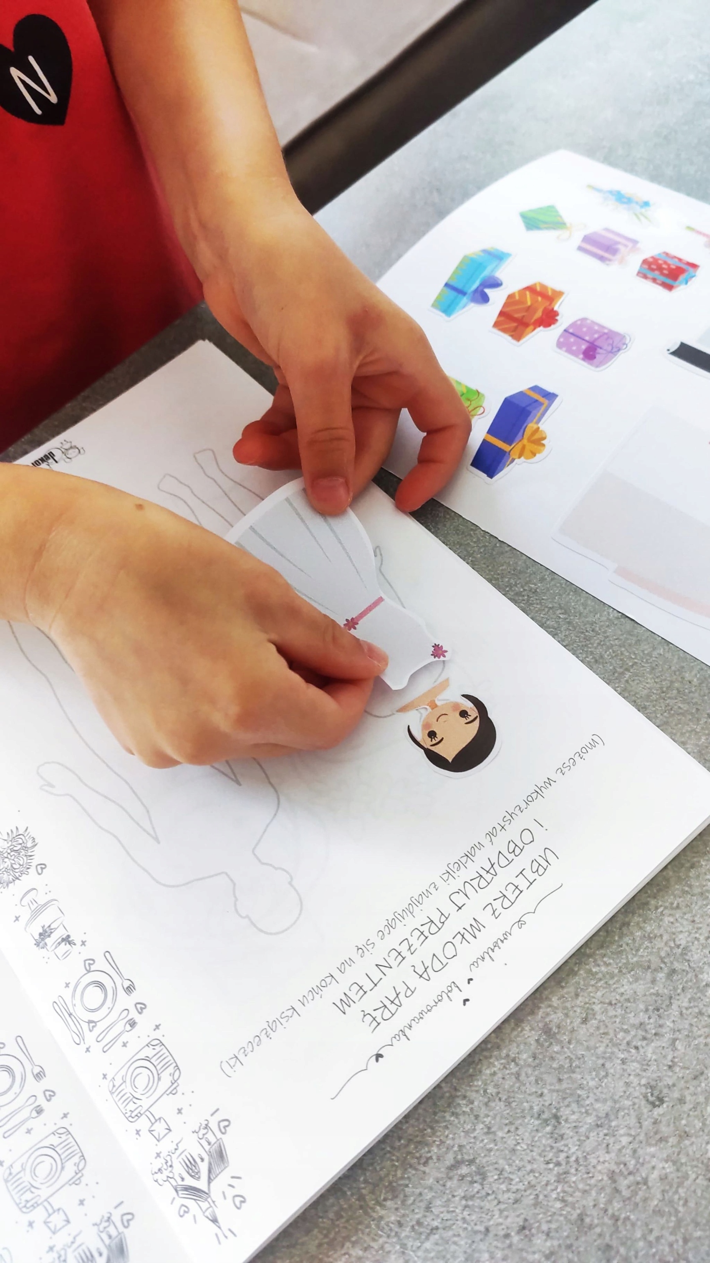 - 2 листа самоклеящихся наклеек и 3 страницы для клей (одеть жениха и невесту и подарить им подарок)