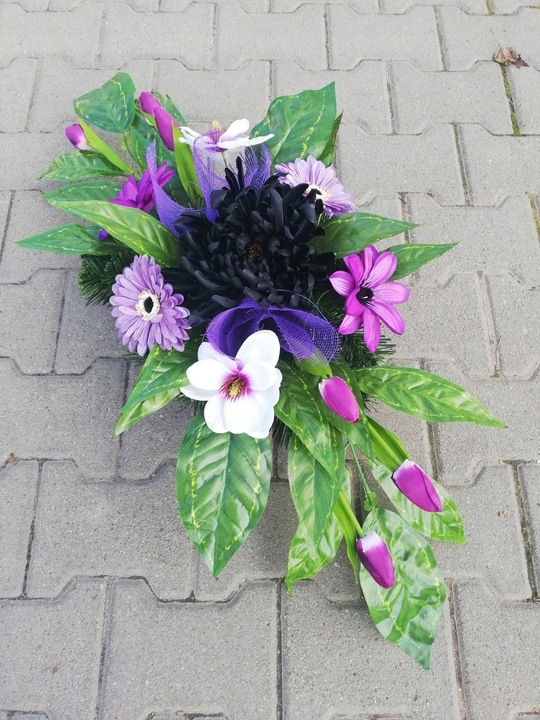 Цветочная композиция на могилу была тщательно изготовлена, с соблюдением модных цветов, из очень качественных материалов и искусственных цветов.