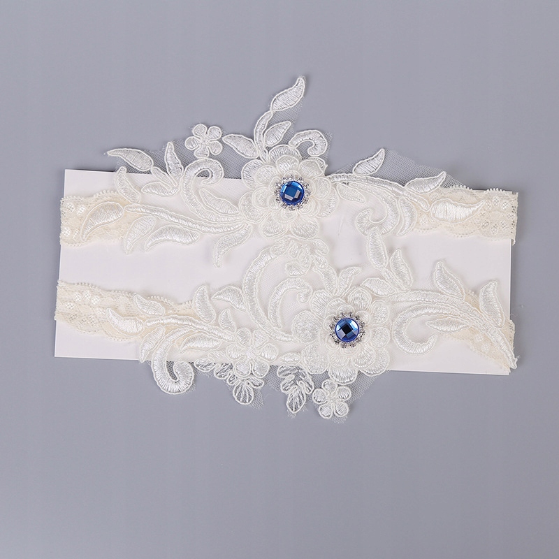 Фантастический свадебный подвязки с кружевом из слоновой кости, украшенный большим синим цирконом. тонкость.