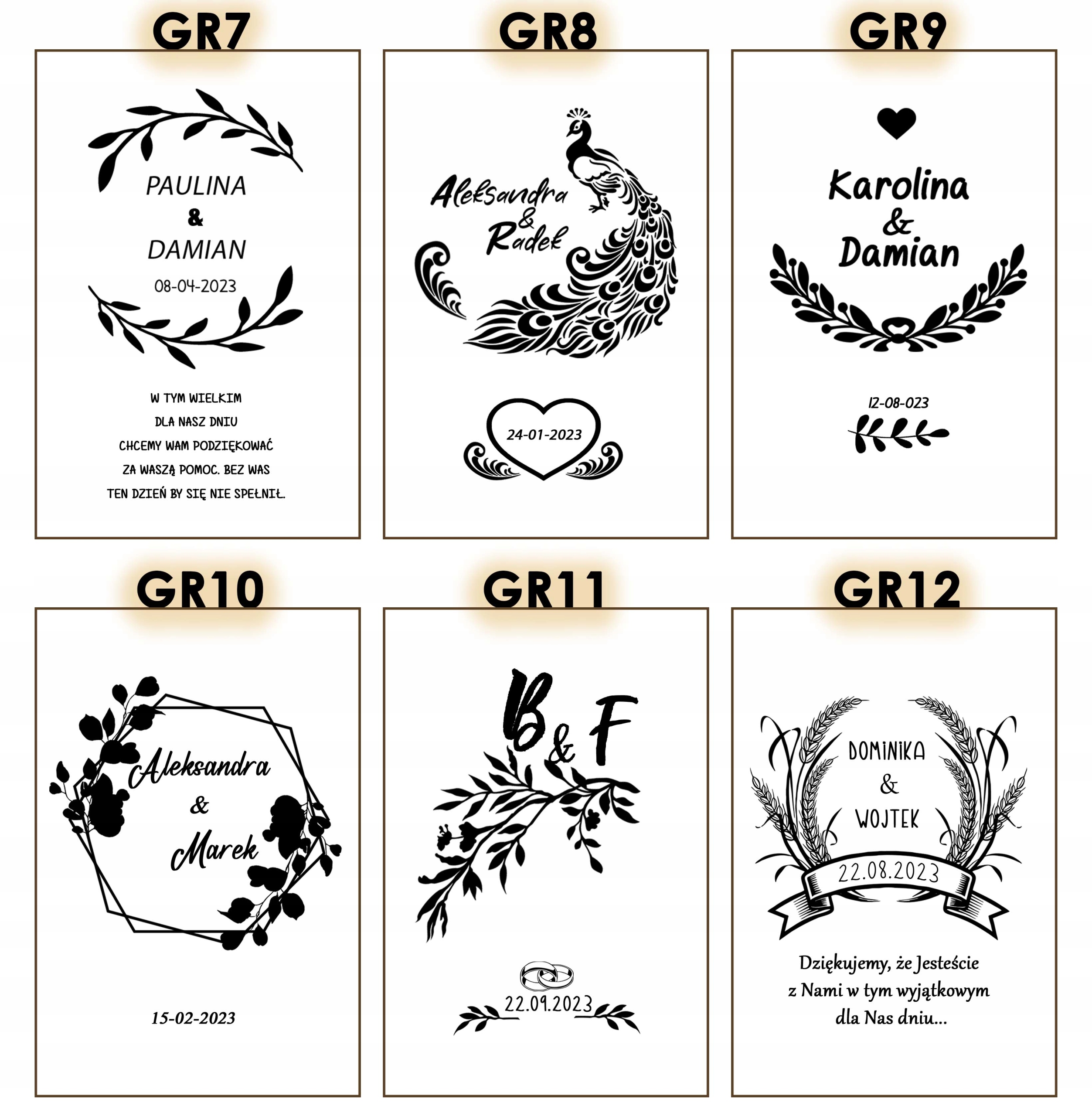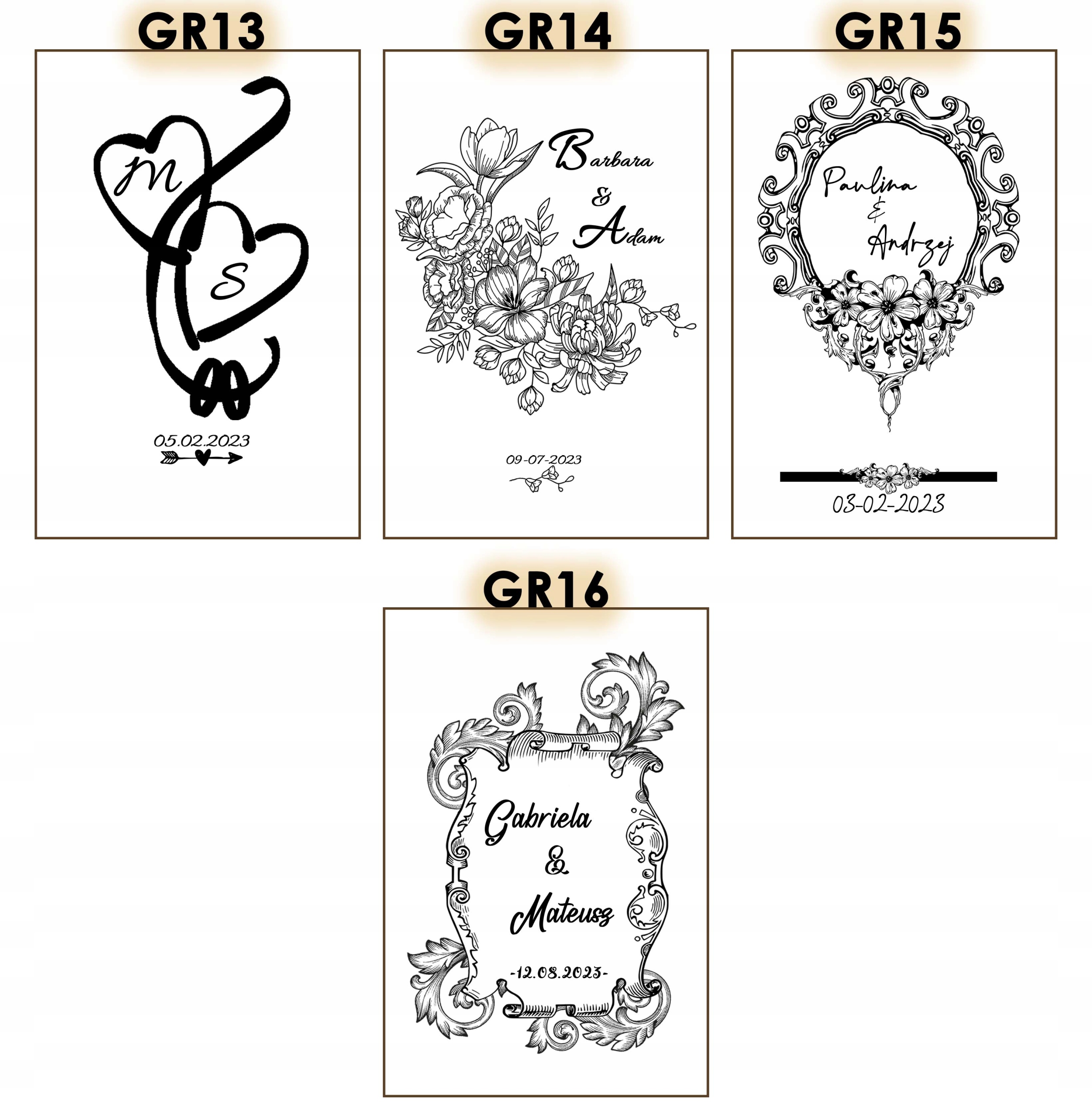 - Дизайны гравировки на груди: Доступно 16 дизайнов (GR1-GR16) с вашей персонализацией (например, имя, дата), которую мы нанесем на деревянную коробку