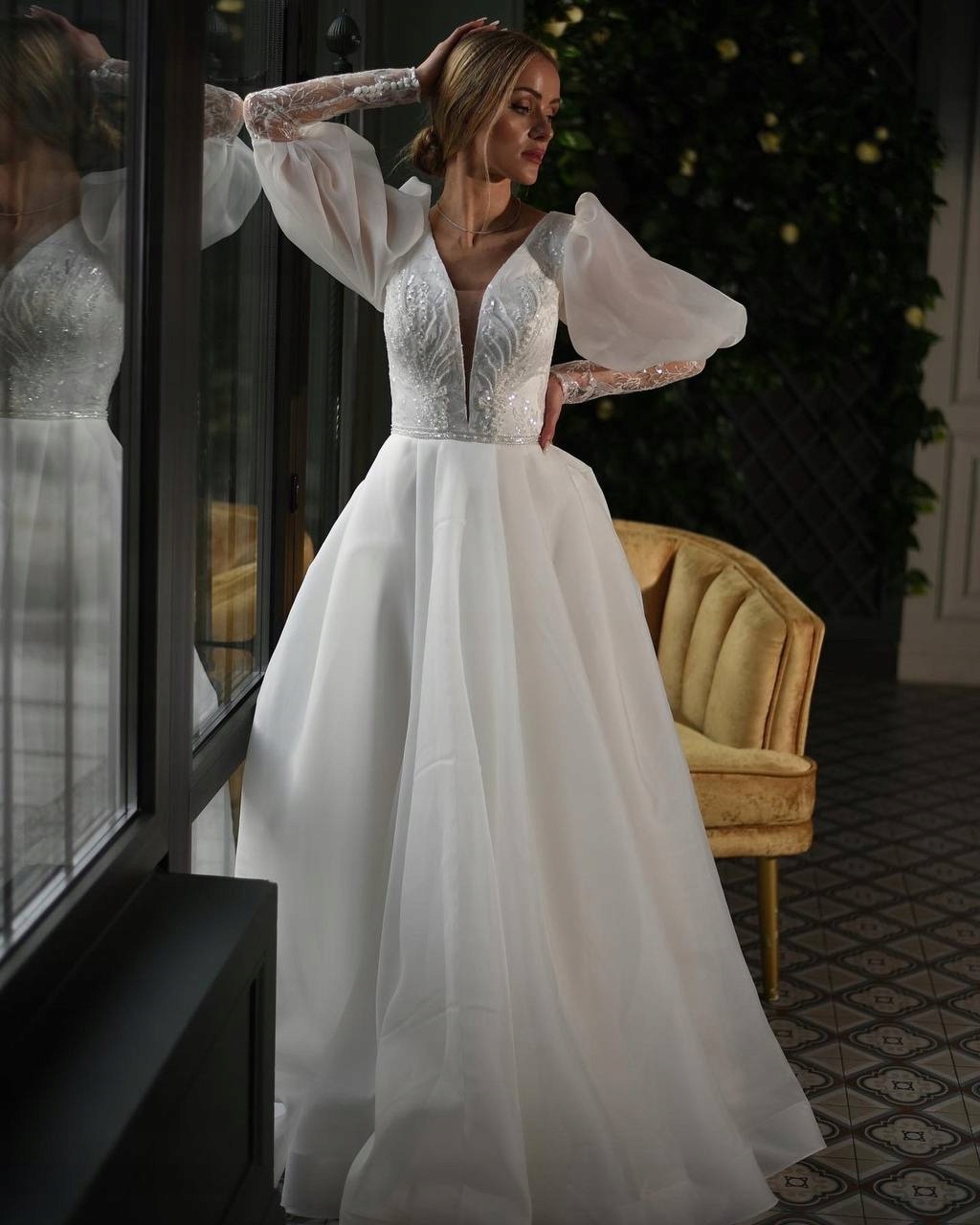 мягкий и легкий. Свадебное платье соблазняется простотой и классическим стилем. Длинные, пухлые рукава с манжетами, украшенные кружевом, четко обозначенная талия и воздушное дно: это творение просто женственное и воздушное. Это позволяет свободно перемещаться на танцполе, а органза, из которой он сшит, представляет собой материал, который мягко отражает свет, чтобы вы могли сиять своим естественным великолепием. В платье вы можете быть выше всех!