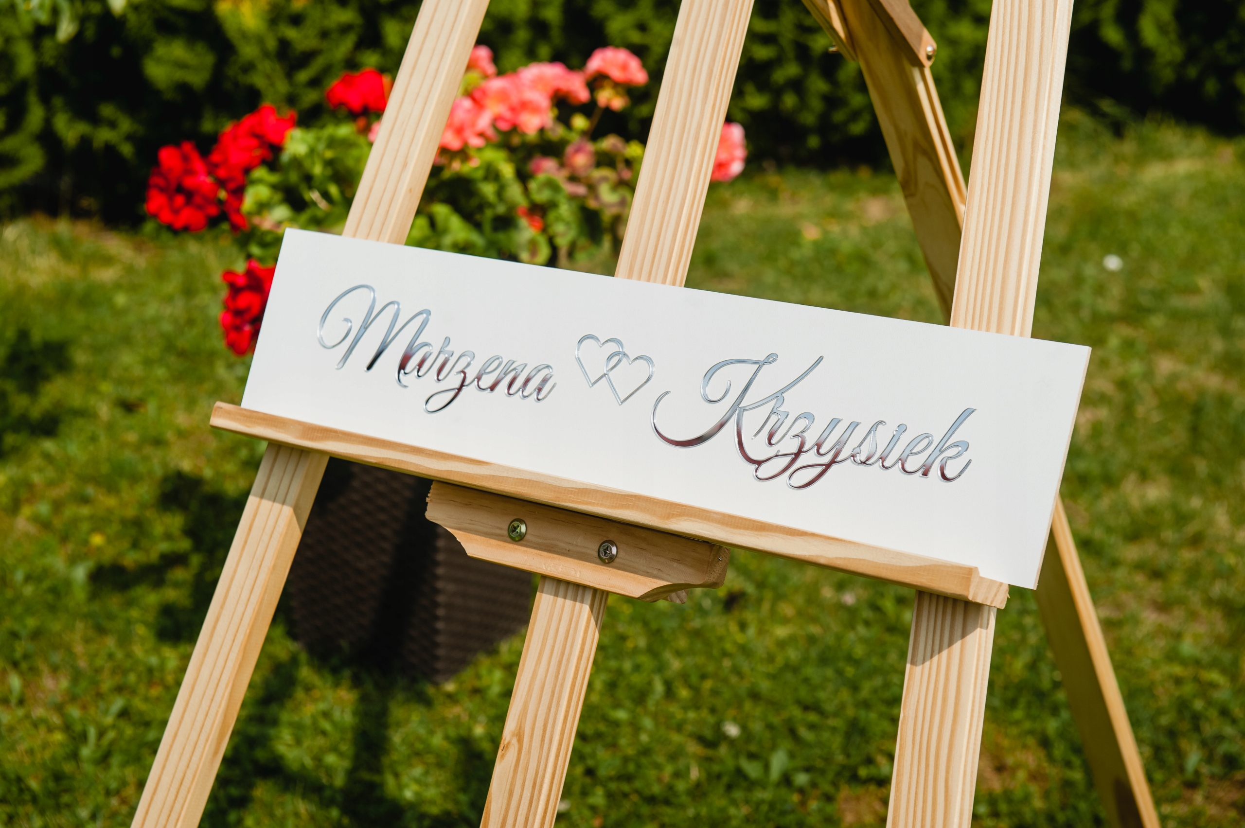 Табличка с декоративным текстом украсит автомобиль в день свадьбы. Надписи выполнены методом лазерной резки из серебристого зеркального оргстекла и наклеены на белые плиты МДФ.