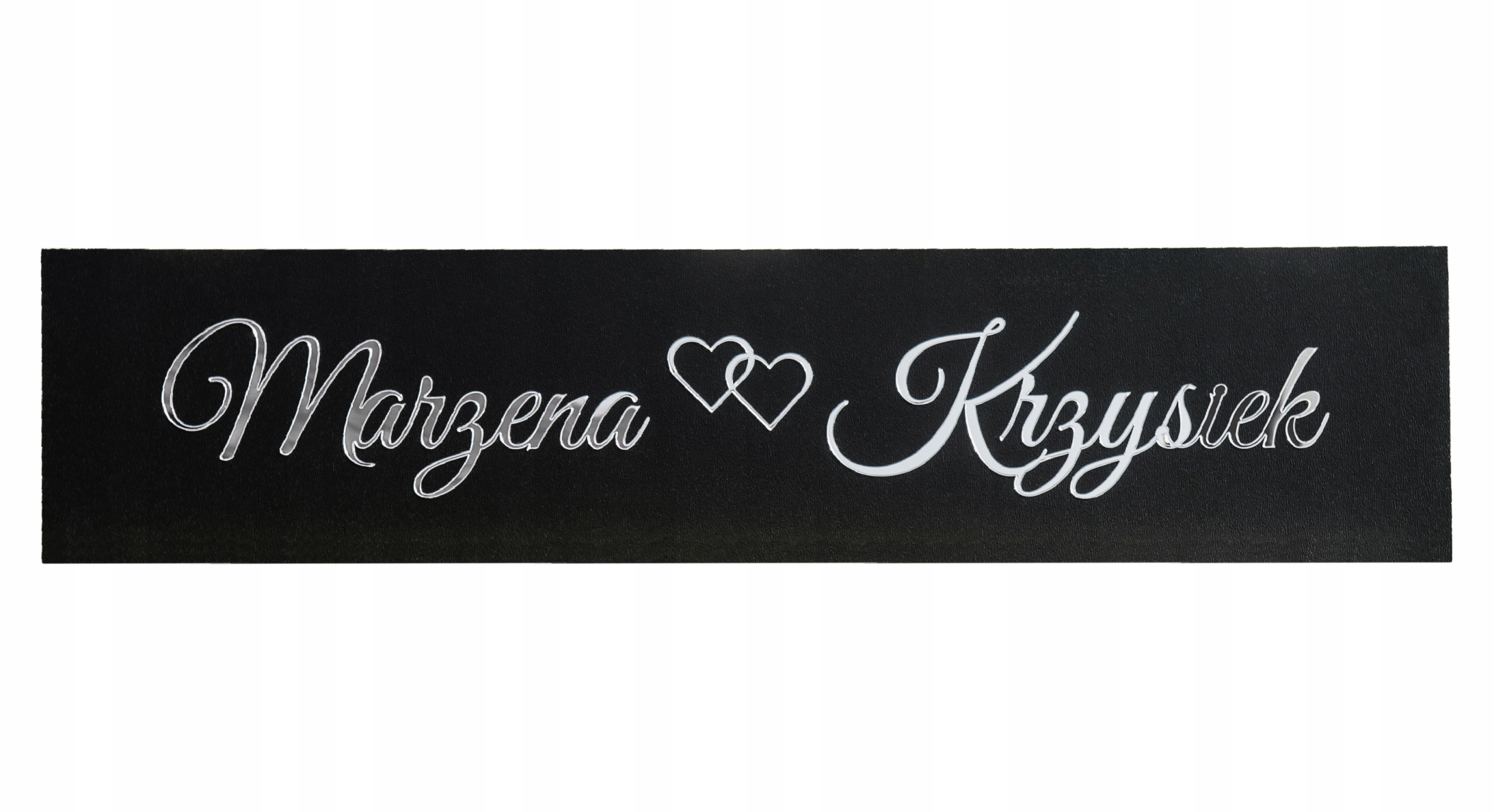 Табличка с декоративным текстом украсит автомобиль в день свадьбы. Надписи выполнены методом лазерной резки из серебристого зеркального оргстекла и наклеены на черные плиты МДФ.