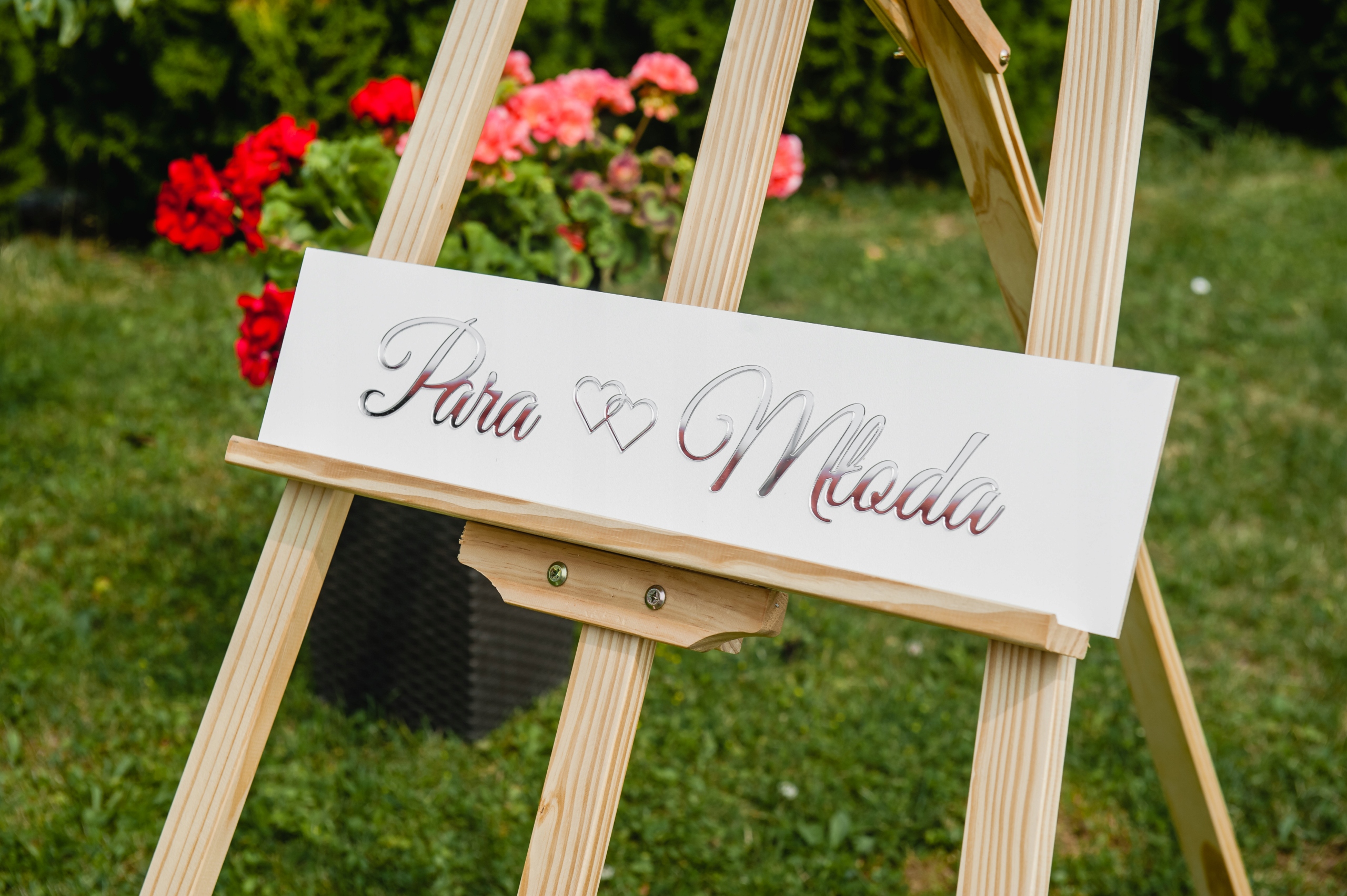 Табличка с декоративным текстом украсит автомобиль в день свадьбы. Надписи выполнены методом лазерной резки из серебристого зеркального оргстекла и наклеены на белые плиты МДФ.