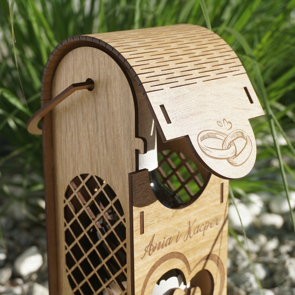 В эту необычную коробку для вина можно элегантно упаковать подарочную бутылку. Очень стильная упаковка, которая прекрасно послужит украшением и непременно произведет впечатление на молодоженов и гостей.