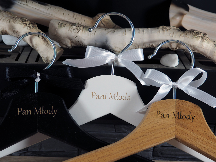 Вешалка доступна в трех цветах: белый, черный или натуральное дерево с надписью Жених, Невеста