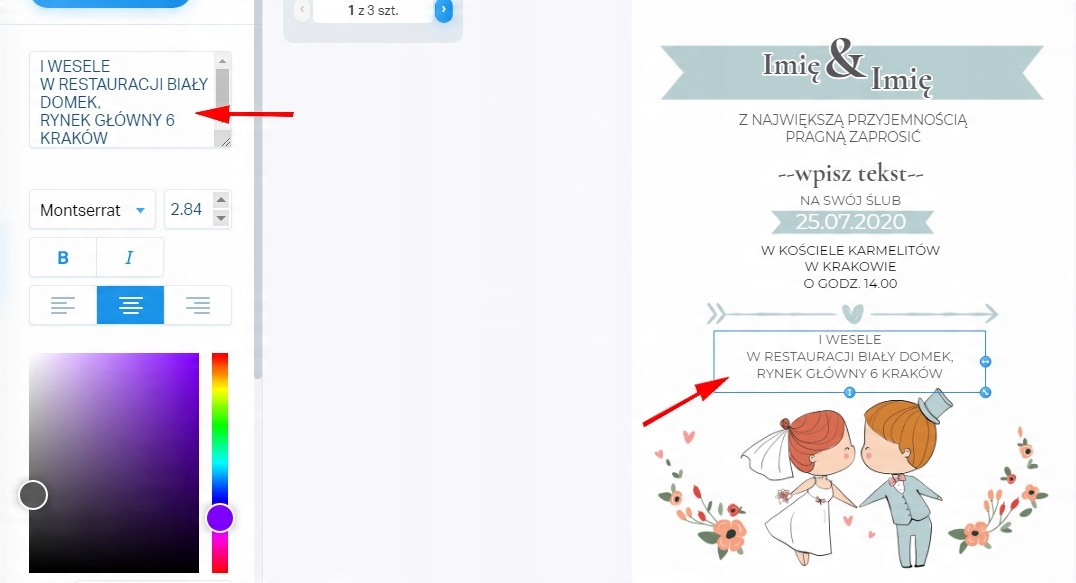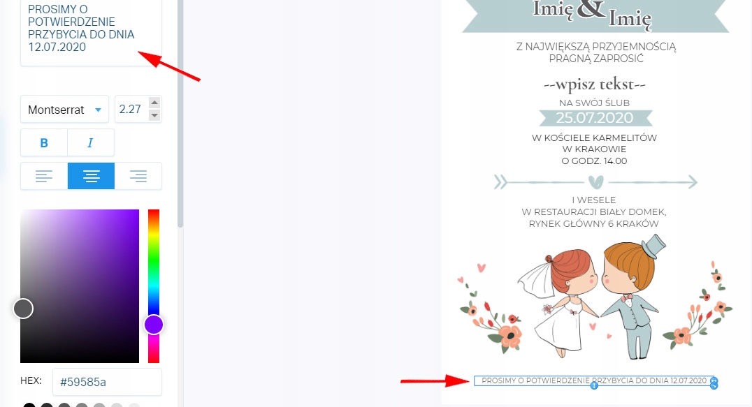 Используя раздел редактирования текста, вы можете изменить размер, цвет и выбрать подходящий вам шрифт из множества доступных в редакторе. Выберите текстовое поле и соответственно персонализируйте его содержимое - введите имена жениха и невесты