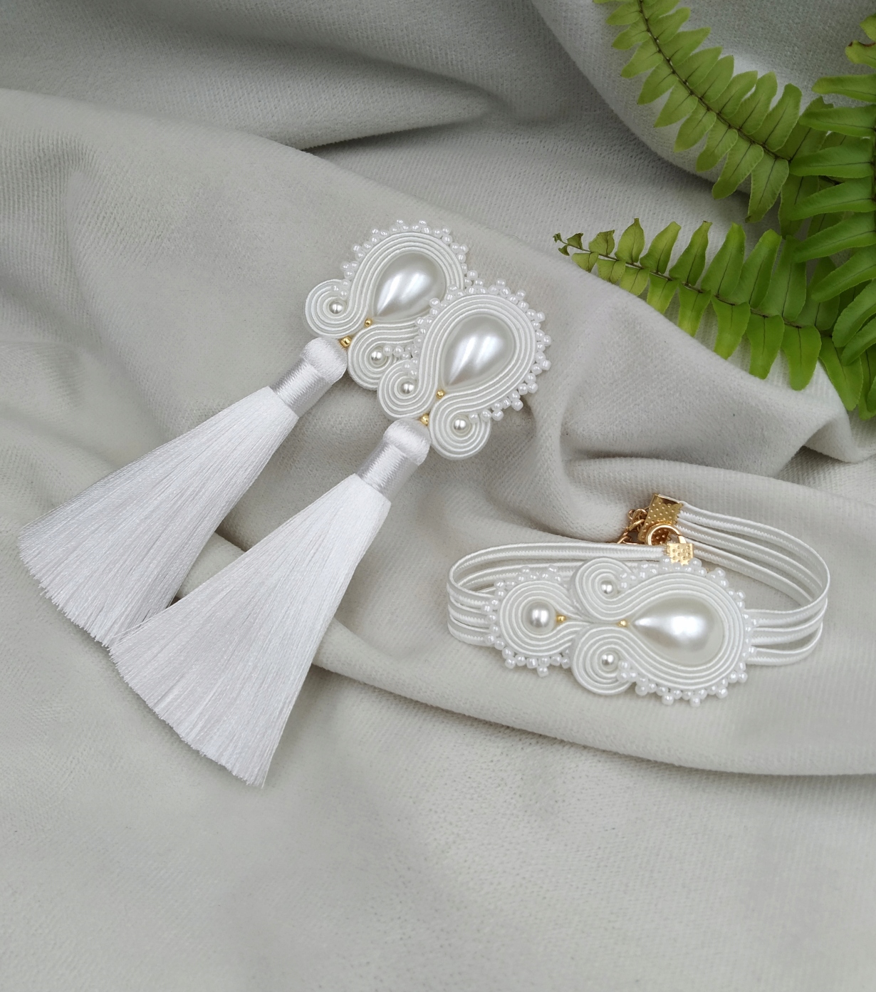 Сутажный комплект, комплект сутажных украшений, свадебные украшения (серьги или клипсы и браслет)