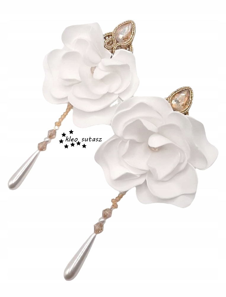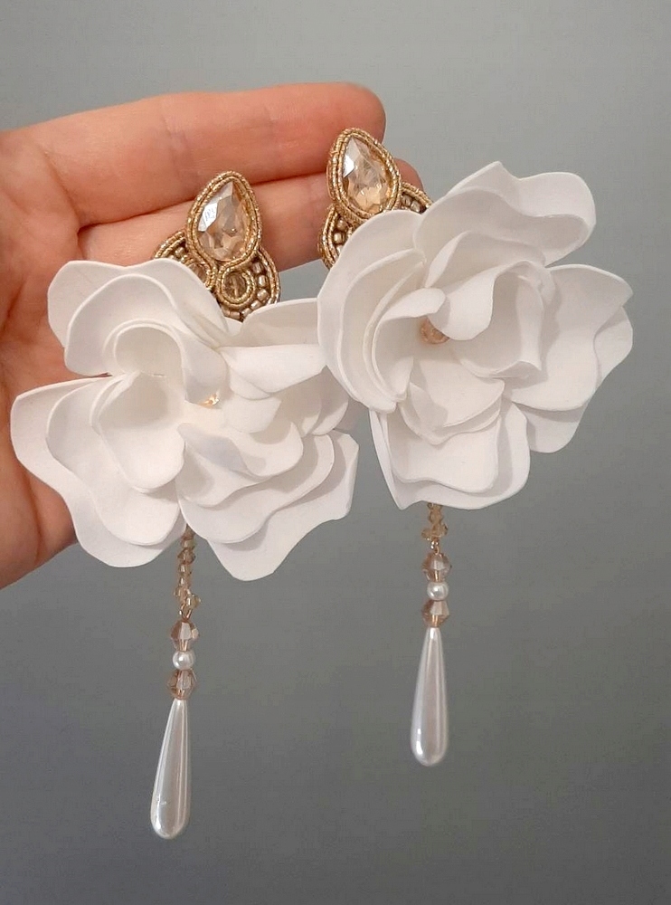 ВЕСІЛЬНІ СЕРЕЖКИ ЗОЛОТО ШАМПАНСЬКЕ БІЛІ КВІТИ 13