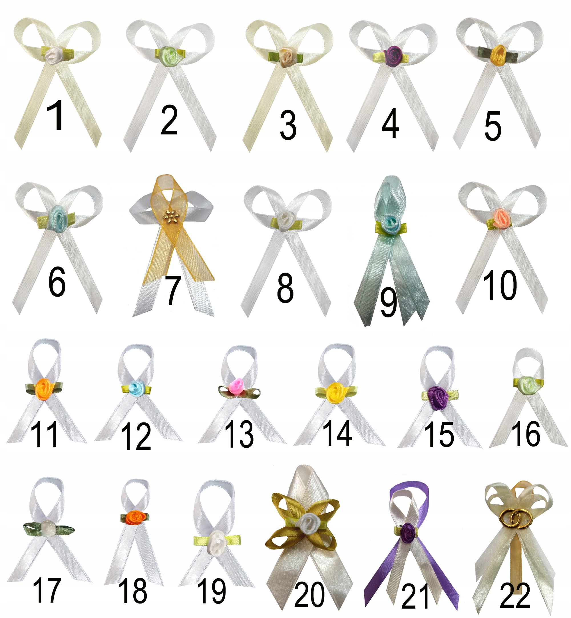 Булавки изготовлены вручную из атласной ленты шириной 0,6 см, украшены розочками, сердечками или обручальными кольцами.