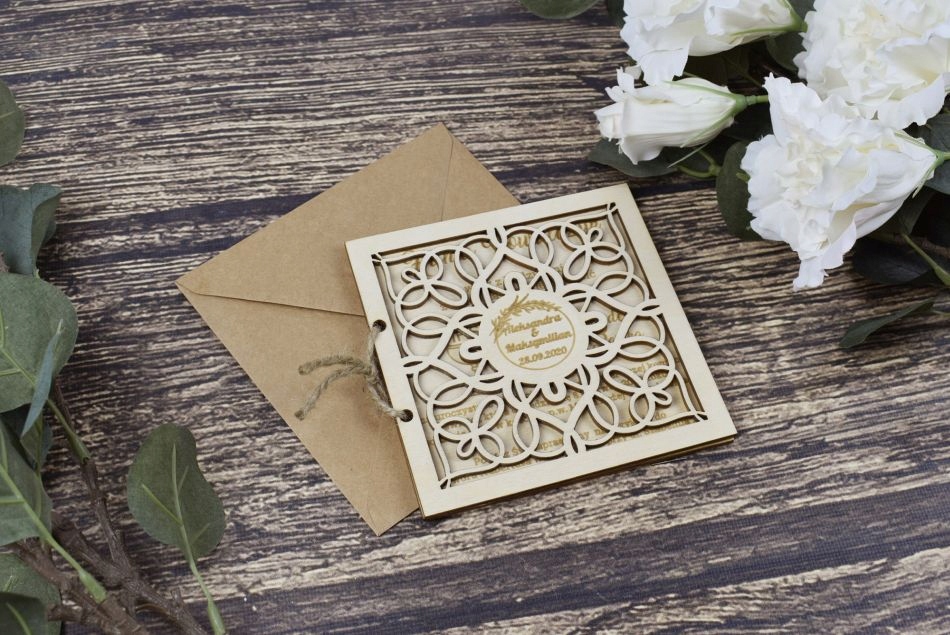 Приглашение в виде деревянной открытки станет идеальным способом подчеркнуть значимость приглашенных гостей – самых главных, то есть родителей.