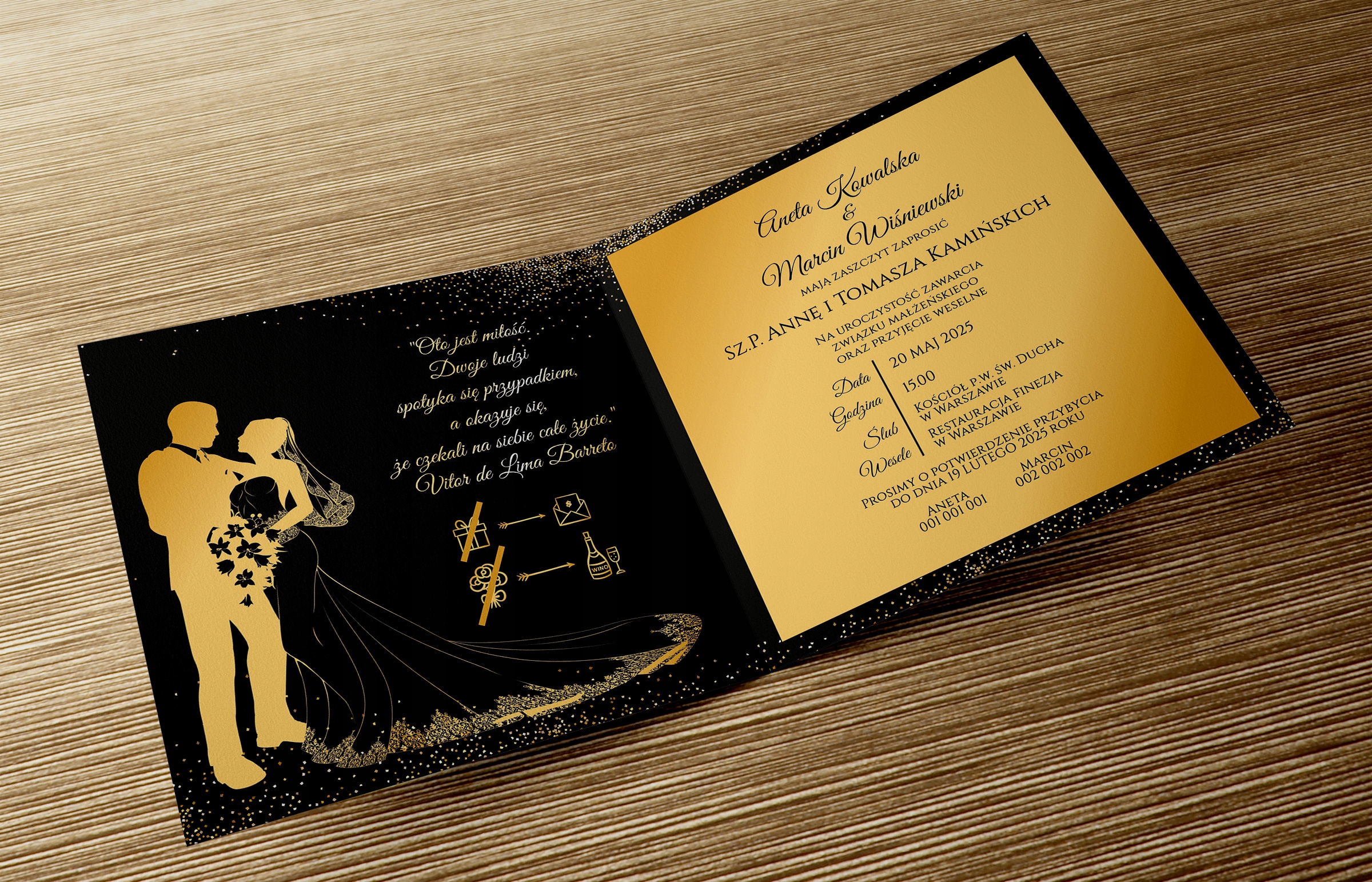 Приглашения на свадьбу из коллекции Золотой пары b> - элегантность и престиж в самом красивом издании. Изготовленные из высококачественной бумаги, напечатанной на современных машинах, они являются идеальным выбором для уникальной церемонии. Классический дизайн подчеркивает красоту золотых акцентов, которые символизируют любовь и уникальность момента. Возможность персонализации и любые изменения в контенте позволяют адаптировать приглашения к индивидуальным потребностям. Коллекция «Золотая пара» - это предложение для молодых пар, которые ценят роскошь и вечный стиль. ( 350g )