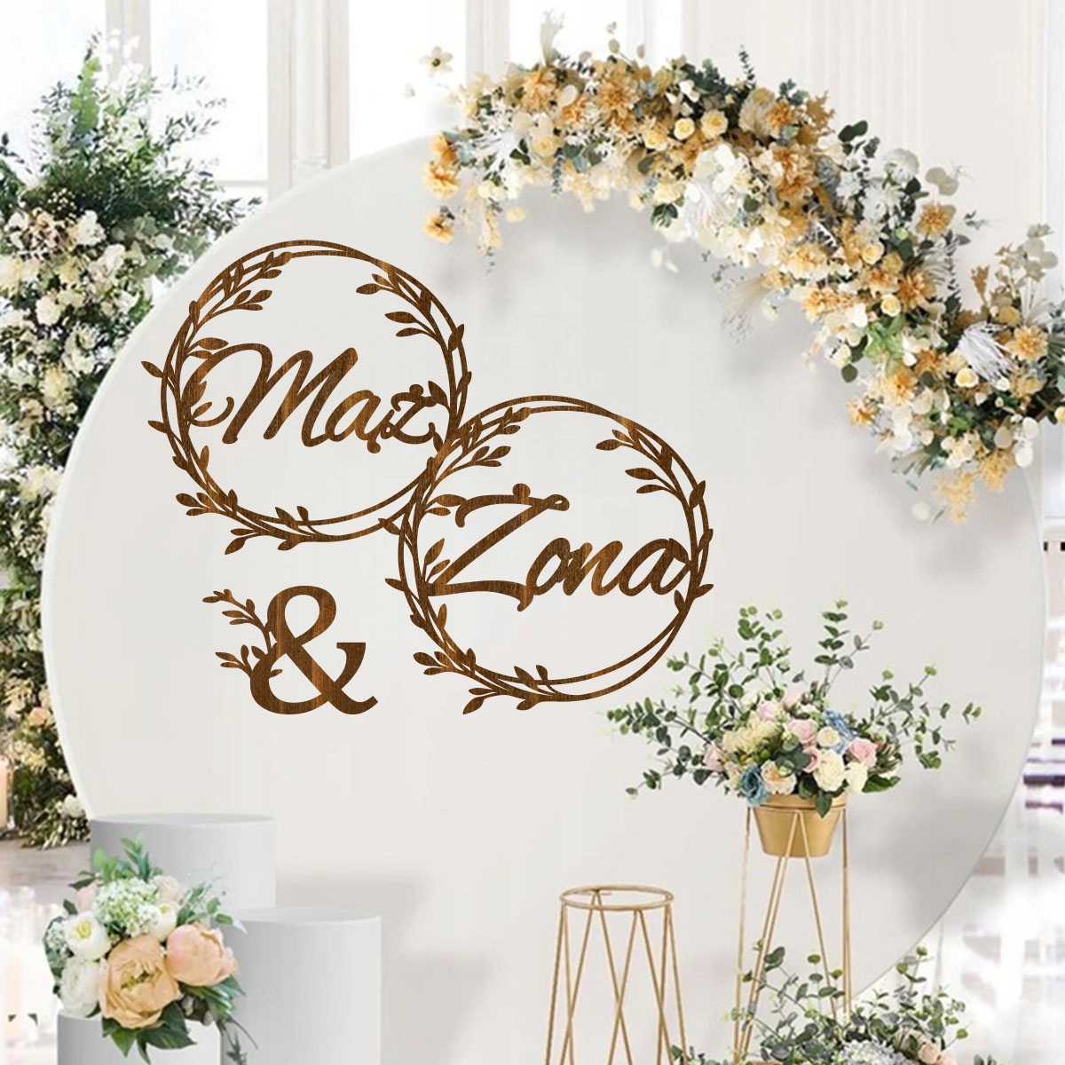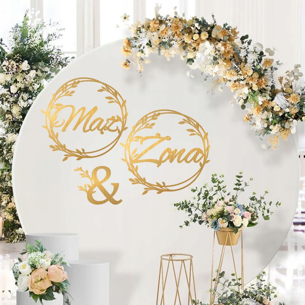 Свадебный баннер Золотые диски надпись муж и жена на стене позади молодой пары