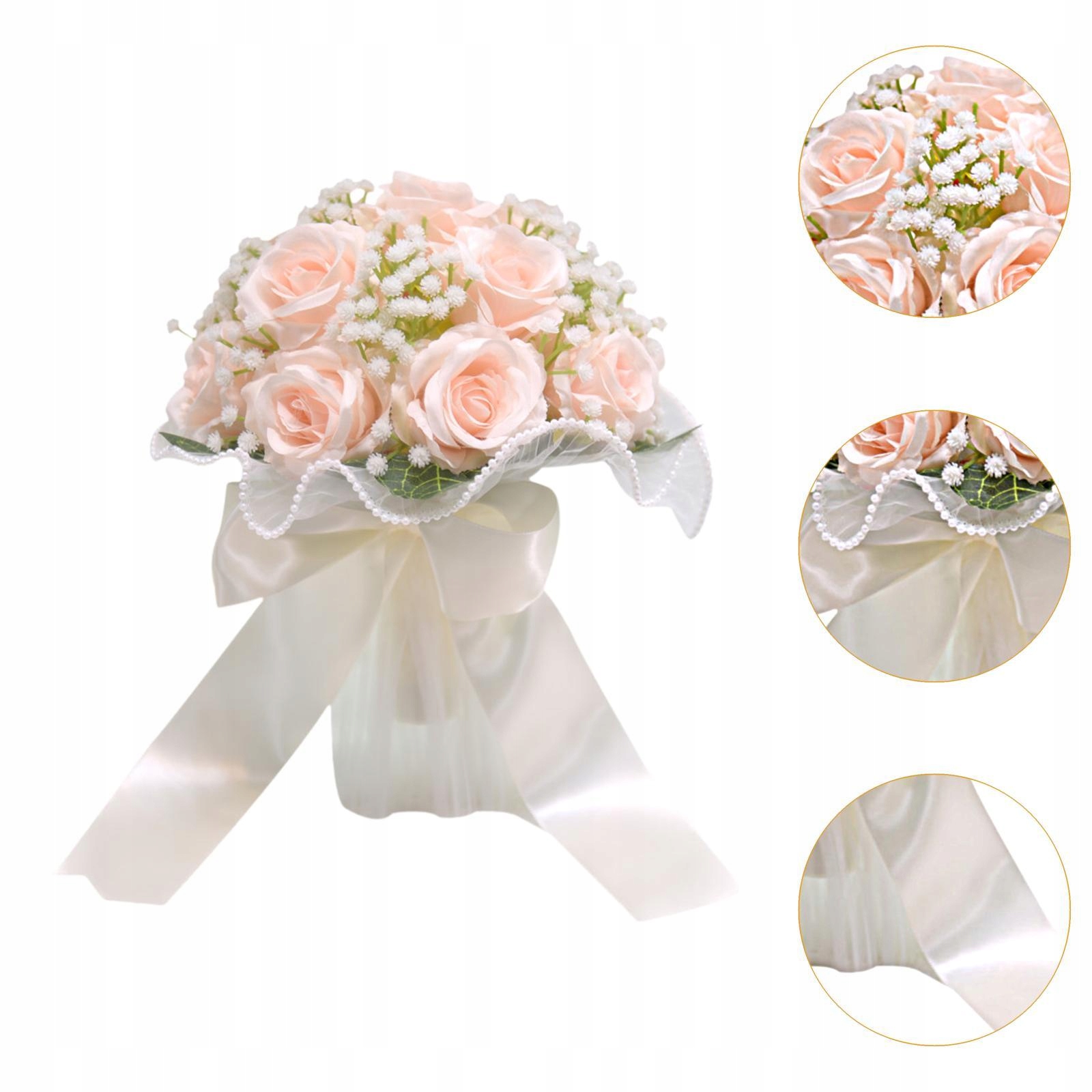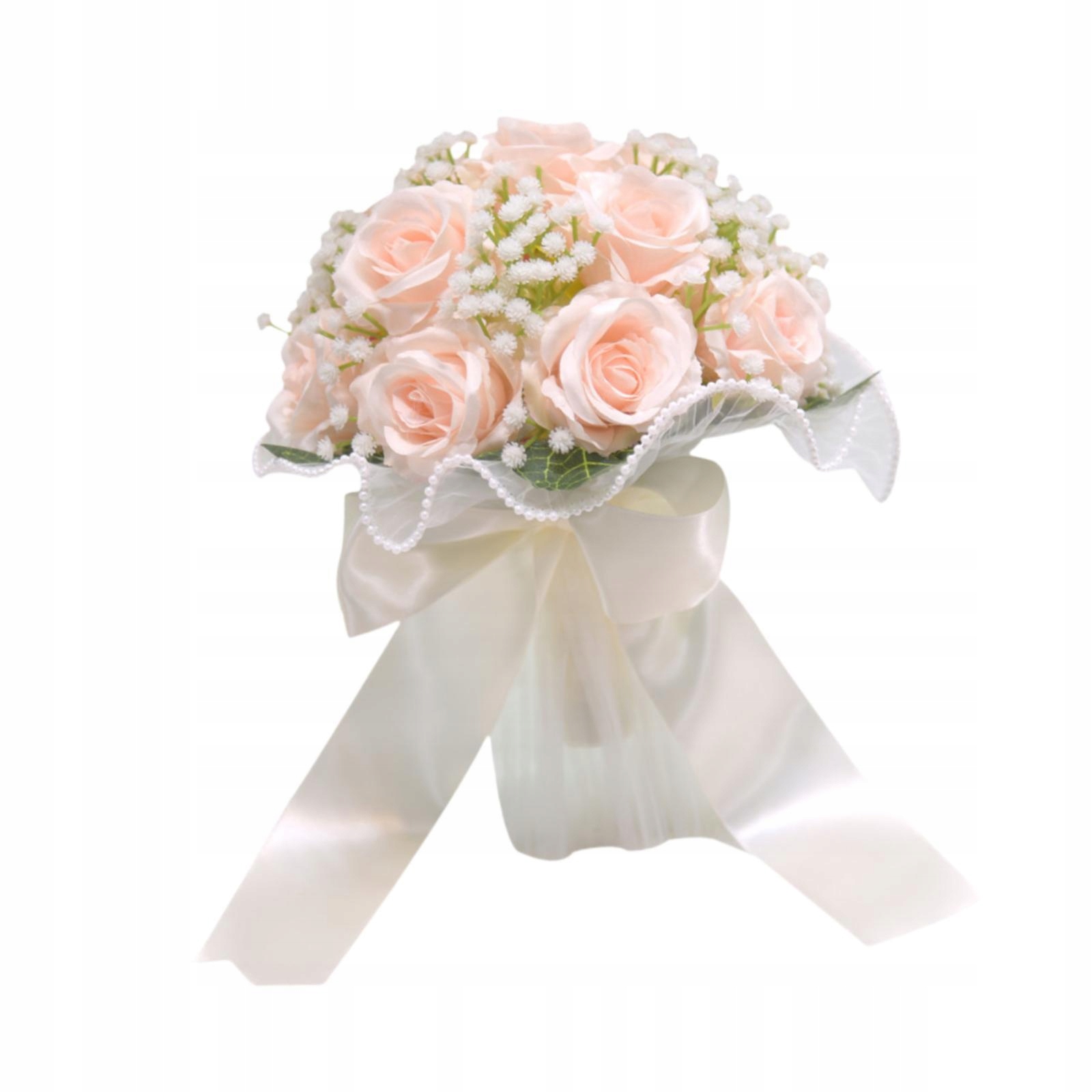 [Свадебный букет]Букет из искусственных цветов изготовлен из зеленых листьев, роз и гипсофилы с декоративными лентами, красивый и красивый, создает очаровательную, классическую и элегантную атмосферу.