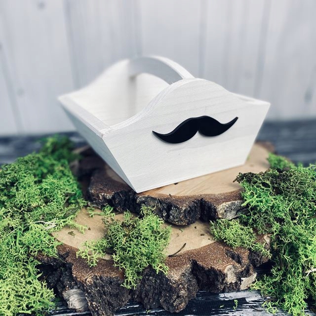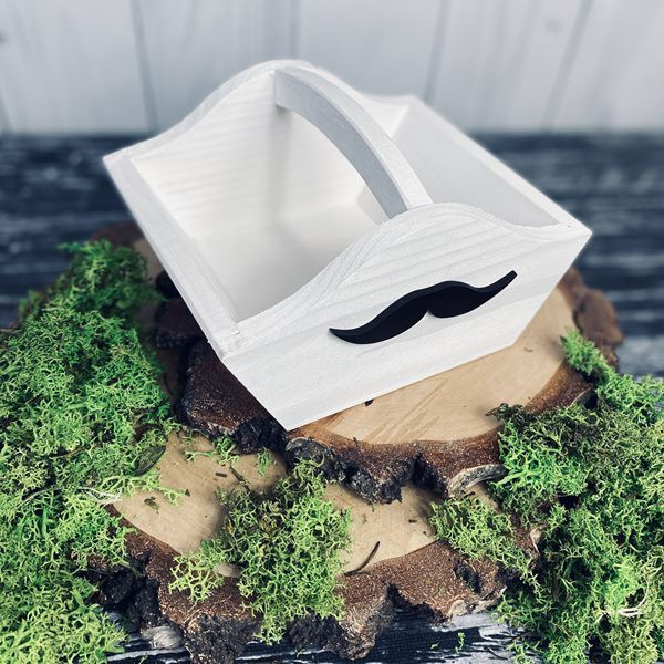 Свадебная спасательная корзина для гостей, посвященная мужчинам. Изготовлен из дерева, пропитан морилкой и украшен графикой в виде усов.