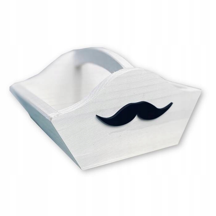 Корзина белого цвета, изготовлена из дерева, а наклеенный рисунок усов выполнен из черного материала HDF. Идеально вписывается в мужской туалет.