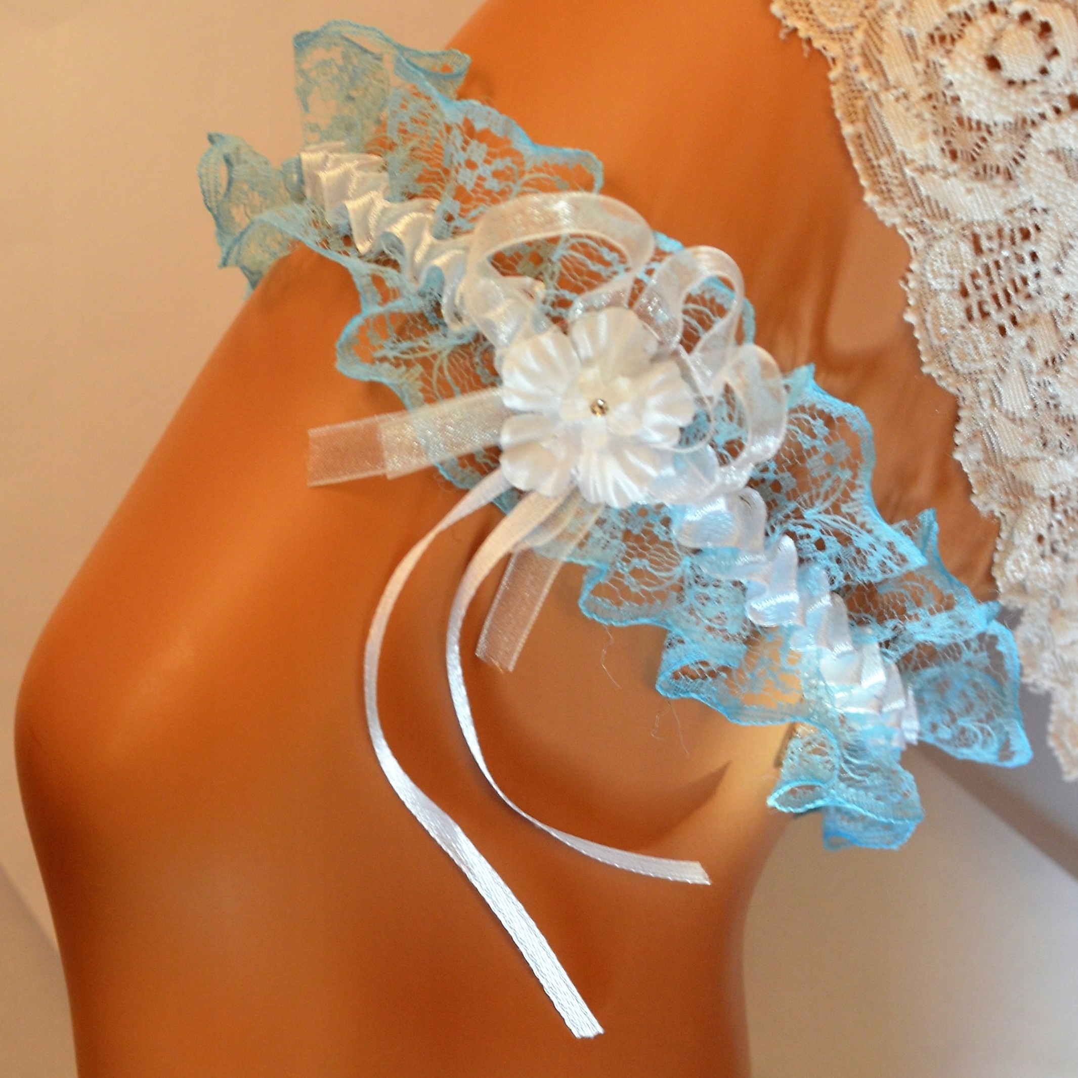 Фантастическая бело-синяя свадебная подвязка из кружева, украшенная красивыми фианитами.