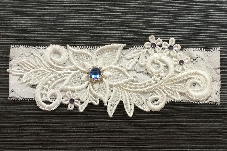 Фантастическая белая кружевная свадебная подвязка, украшенная крупным синим цирконом.