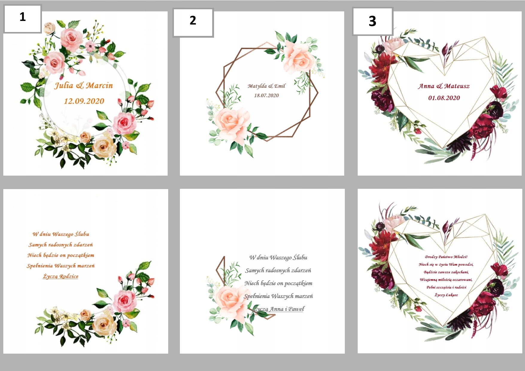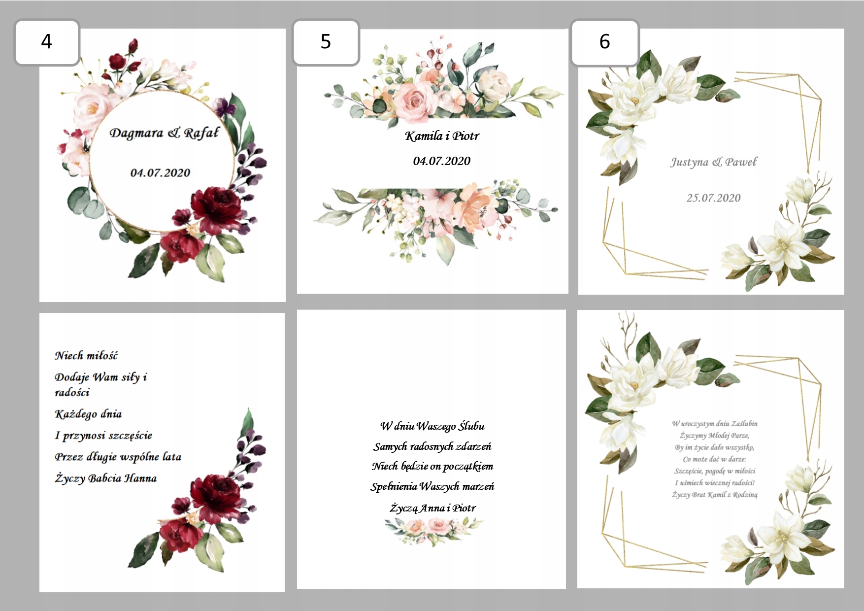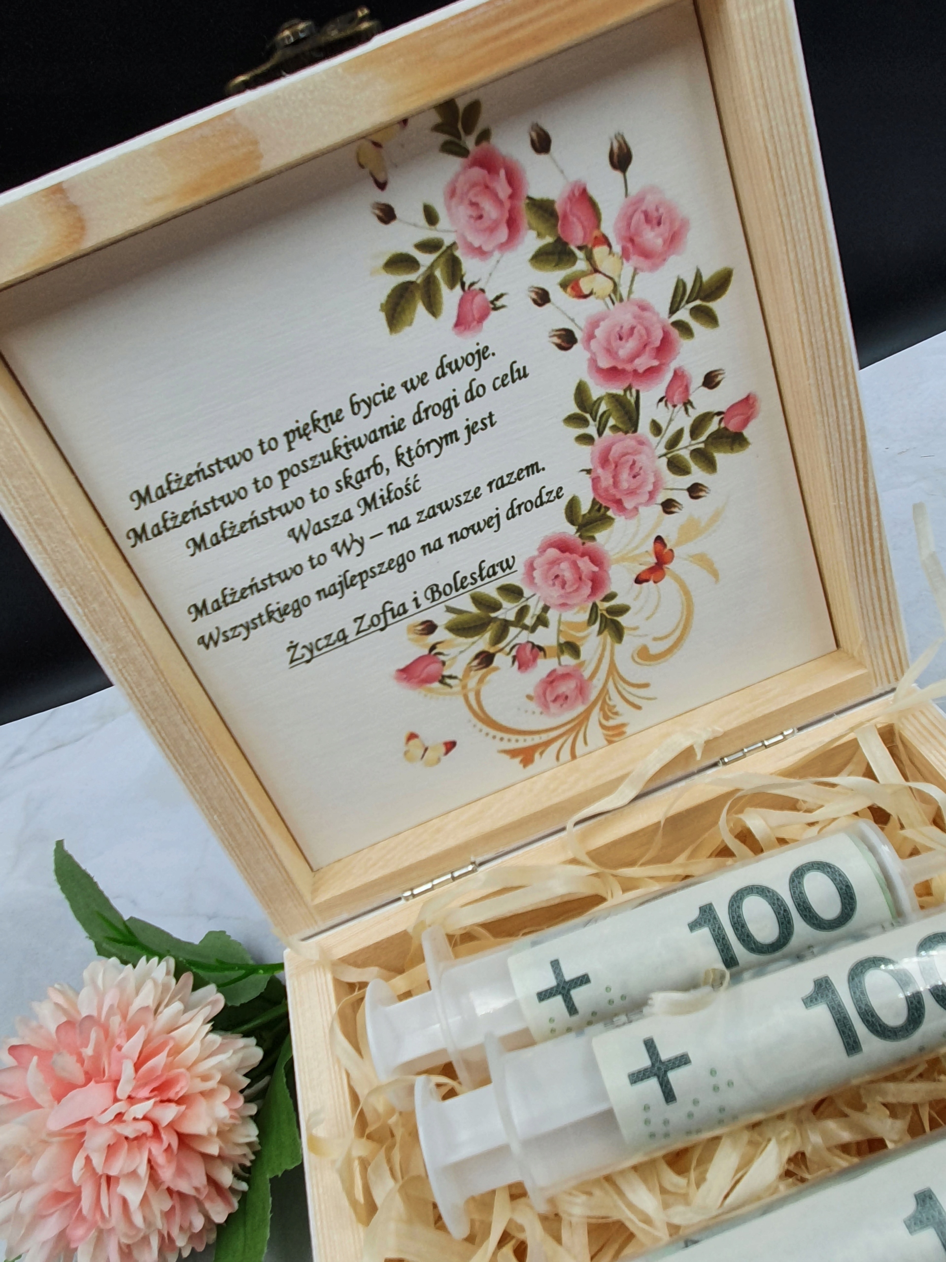 В шкатулке указаны имена жениха и невесты, а также имена людей, дарящих подарок. Вы также можете выбрать из большого количества свадебных пожеланий (вы можете отправить свои собственные) и 12 цветочных изображений.