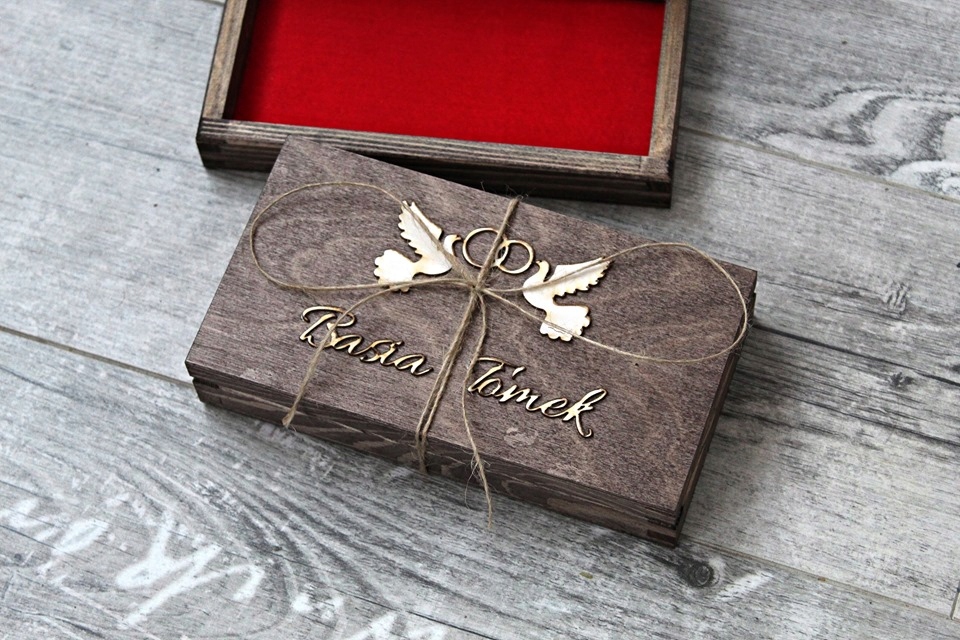 Деревянный ящик, окрашенный в цвет темного дерева (коричневый). Украшен декором (голубями) и именами, облицованными красным фетром, с пожеланиями.