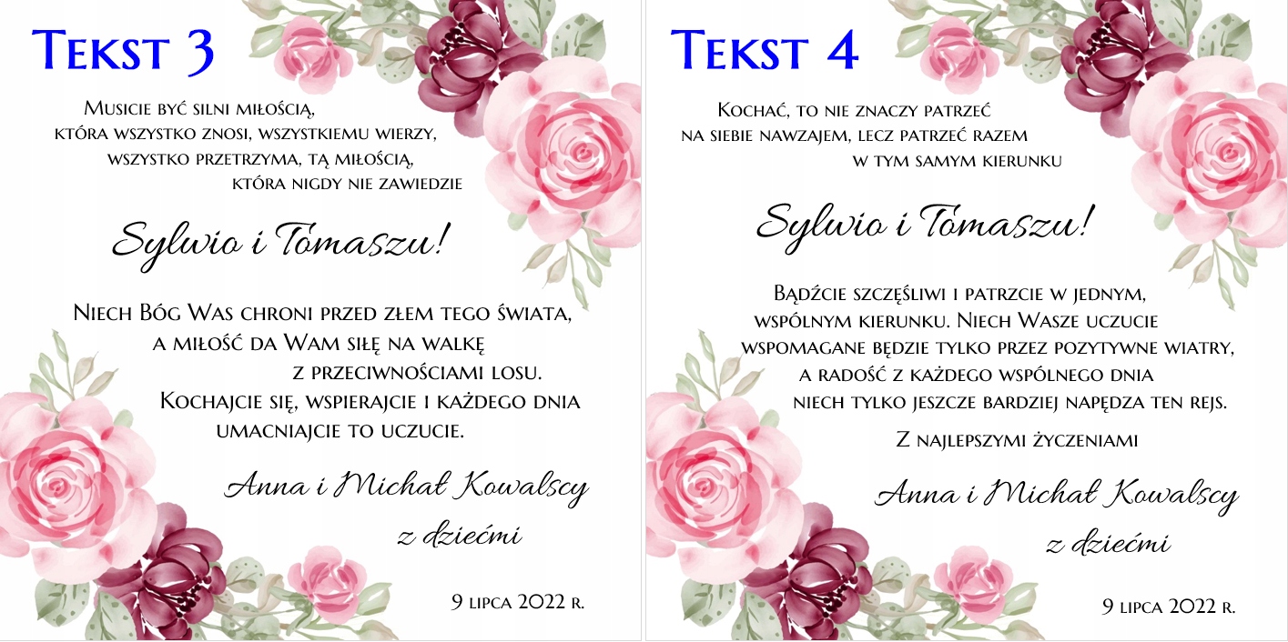 - вернуть молодым людям (например, Монике и Мариушу, Молодая пара, Дорогие дети) в том виде, в котором они должны быть вписаны в сувенир