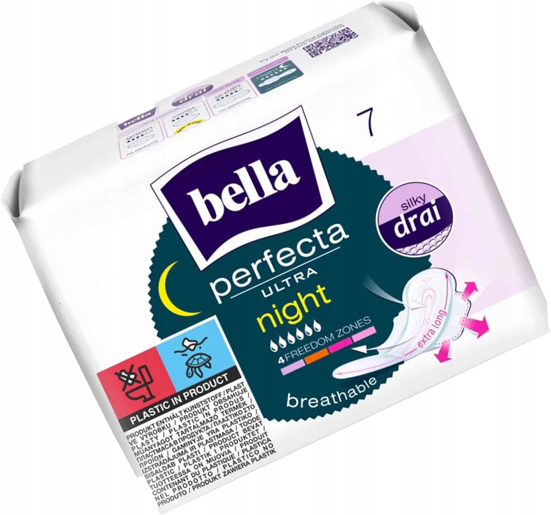 Свойства гигиенических прокладок Bella Perfecta Ultra Night Шелковистая прокладка: Благодаря использованию шелковистой сетки гигиенические прокладки исключительно нежны на ощупь. Это снижает риск раздражения даже у женщин с чрезвычайно чувствительной кожей. 2 боковая защита: гигиенические прокладки имеют увеличенную поверхность боковых накладок, благодаря чему они еще лучше прилегают к нижнему белью. Дополнительные боковые ремни защищают от протеканий. Abso-core: Благодаря содержанию суперабсорбентов прокладки обеспечивают высокую впитывающую способность и нейтрализуют интимный запах. Воздух: гигиенические прокладки обеспечивают коже исключительный комфорт благодаря использованию паропроницаемых материалов.