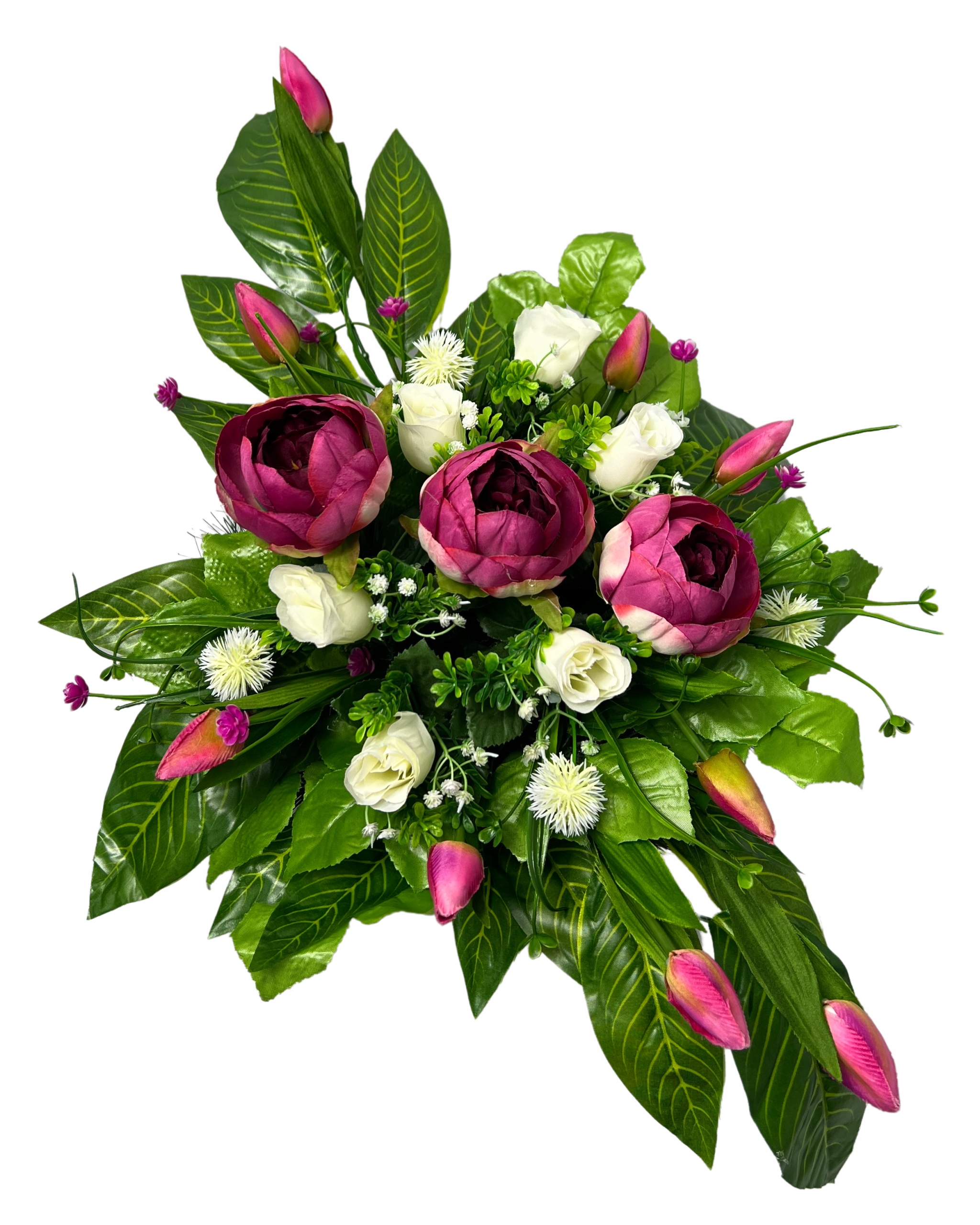 Надгробие с букетом выполнено из высококачественных искусственных цветов, которые вместе создайте уникальный цветочный декор, сочетающий в себе элегантность и утонченность.