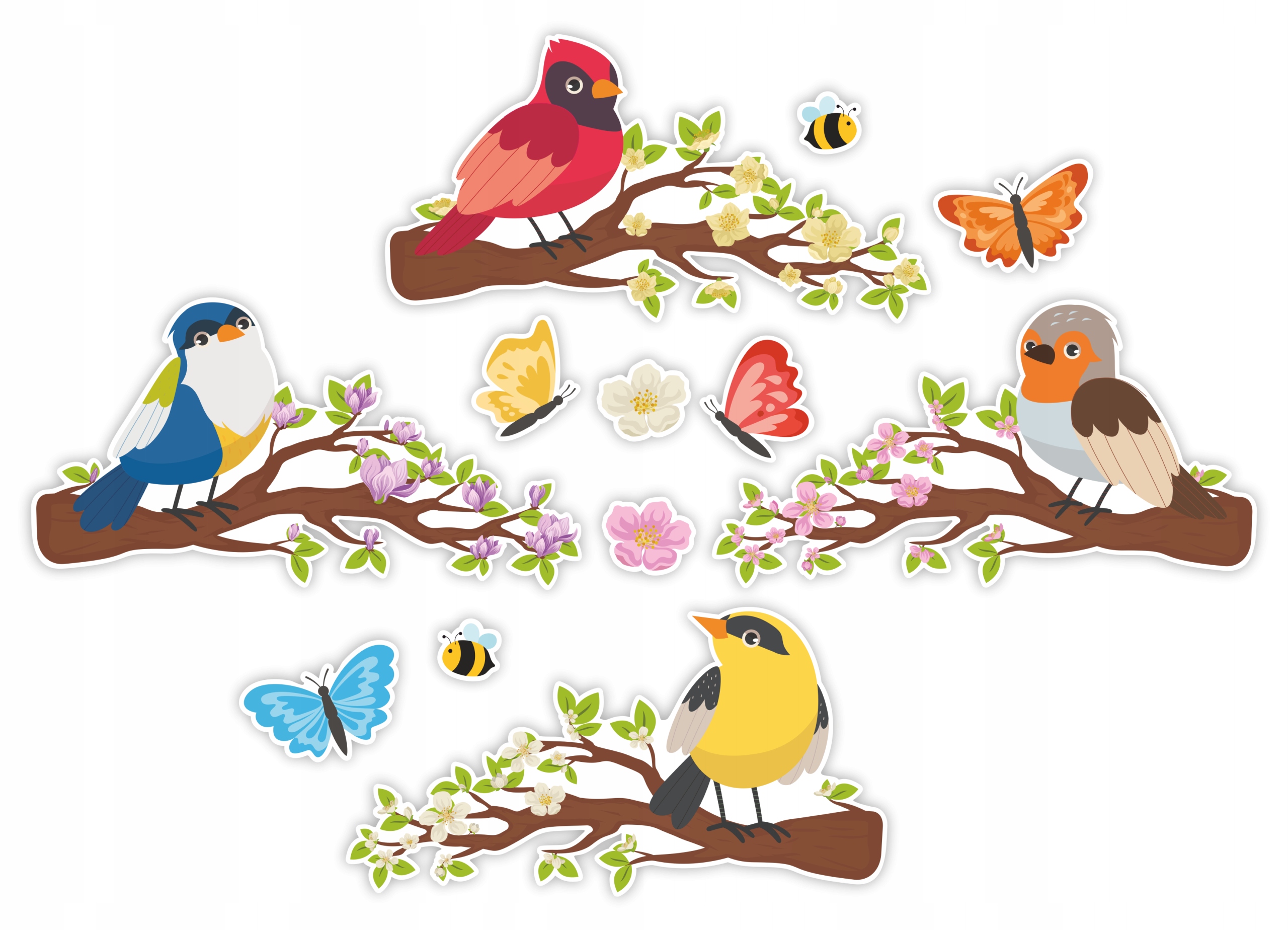 Большой набор украшений состоит из из 4-х крупных птиц, 4-х бабочек, 2-х пчел и 2-х цветков - идеально подходит для весеннего оформления школ и детских садов.