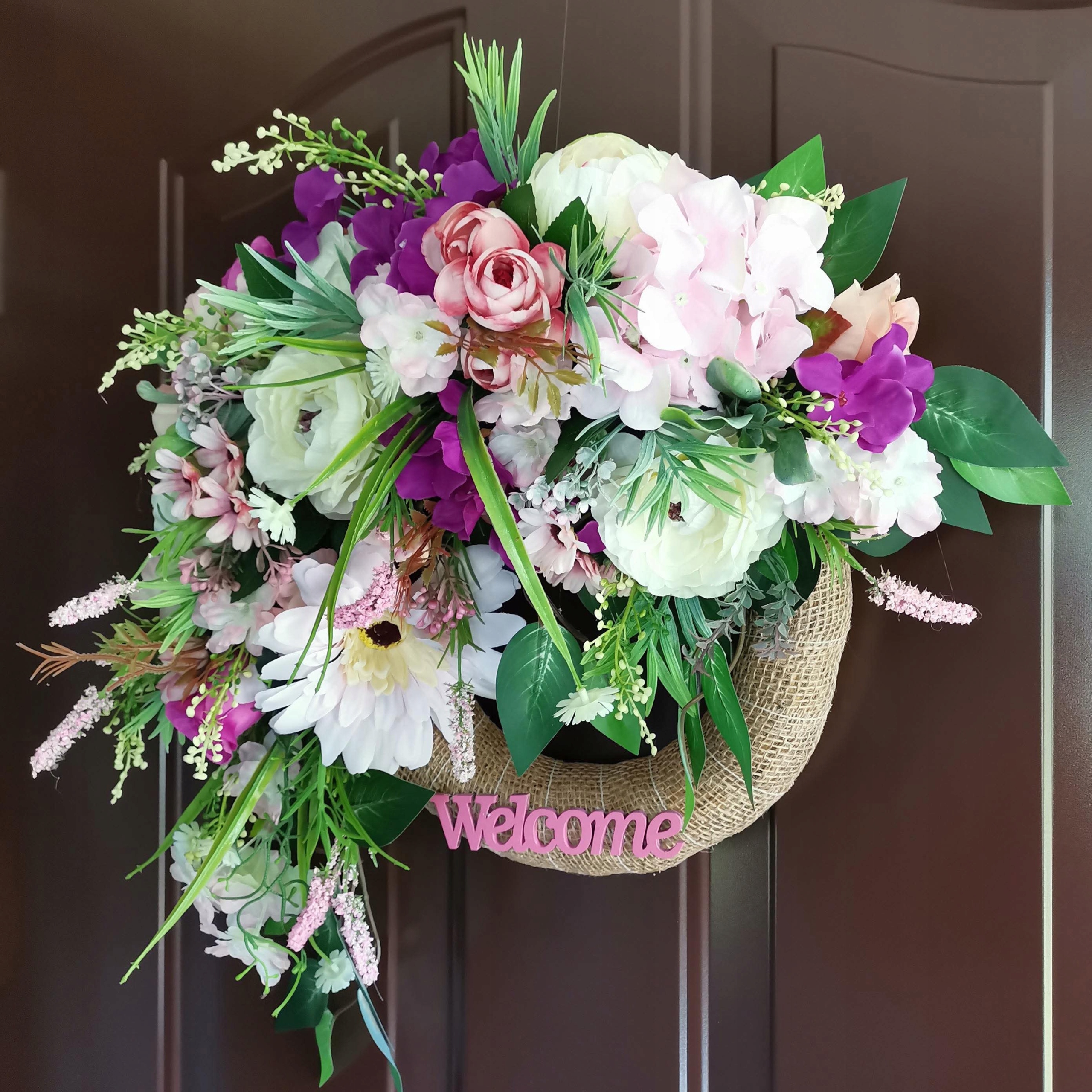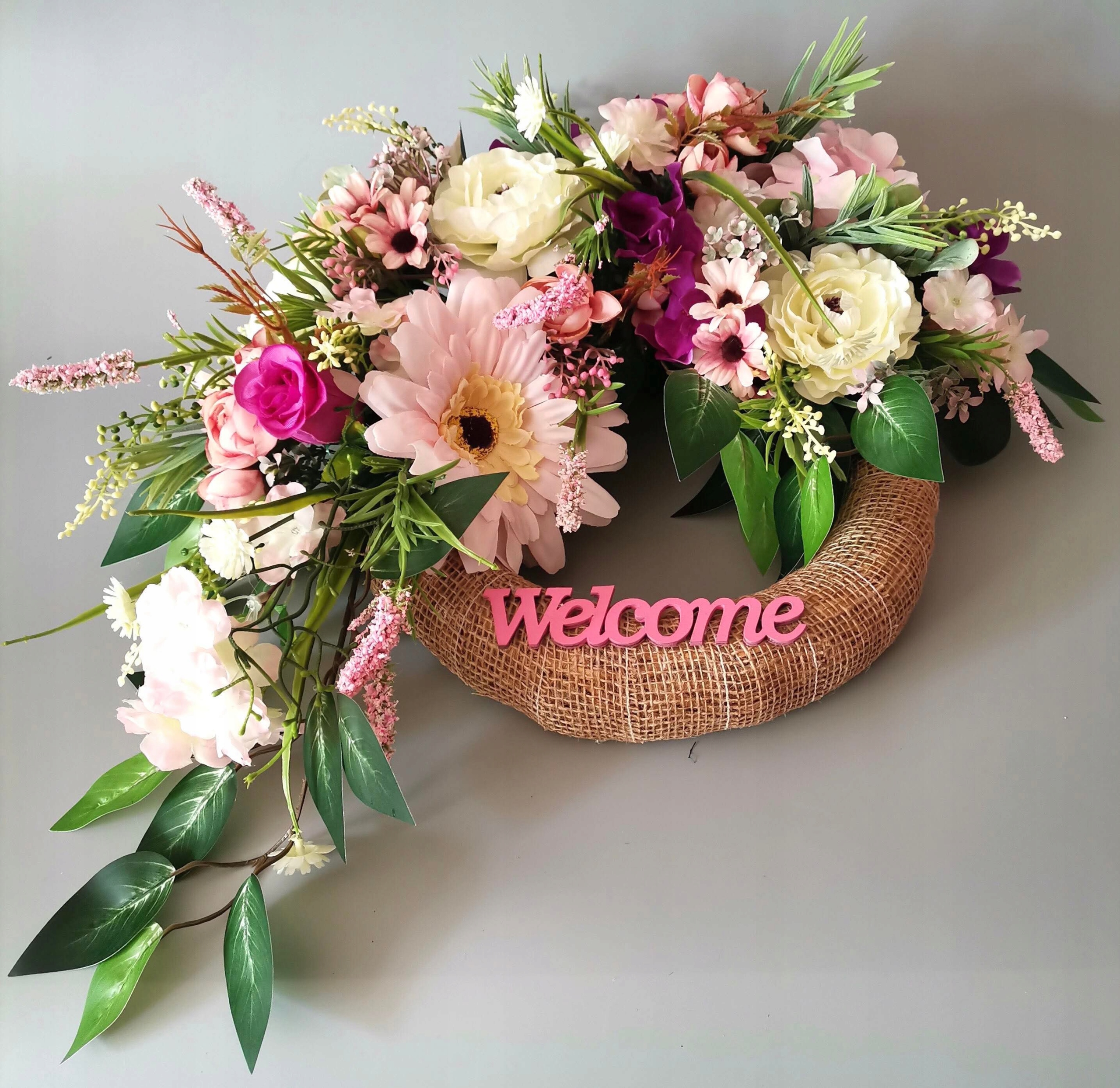 Весенне-летний приветственный венок WELCOME на дверь 40 см, нежно-розовый