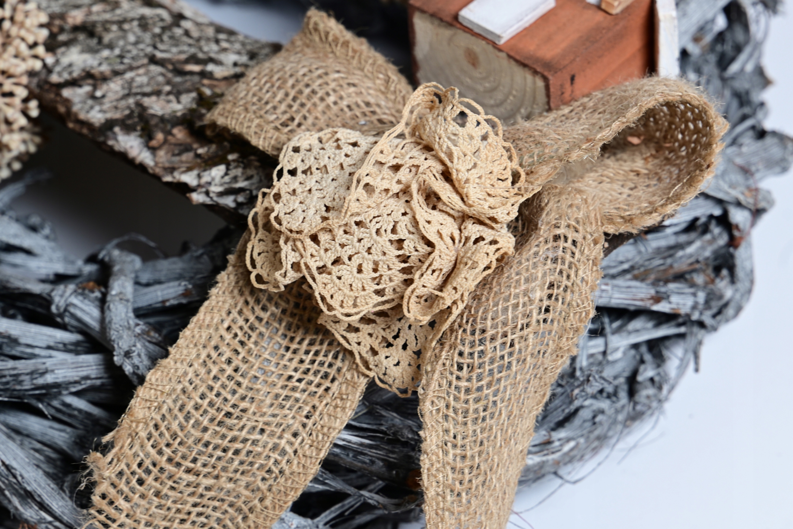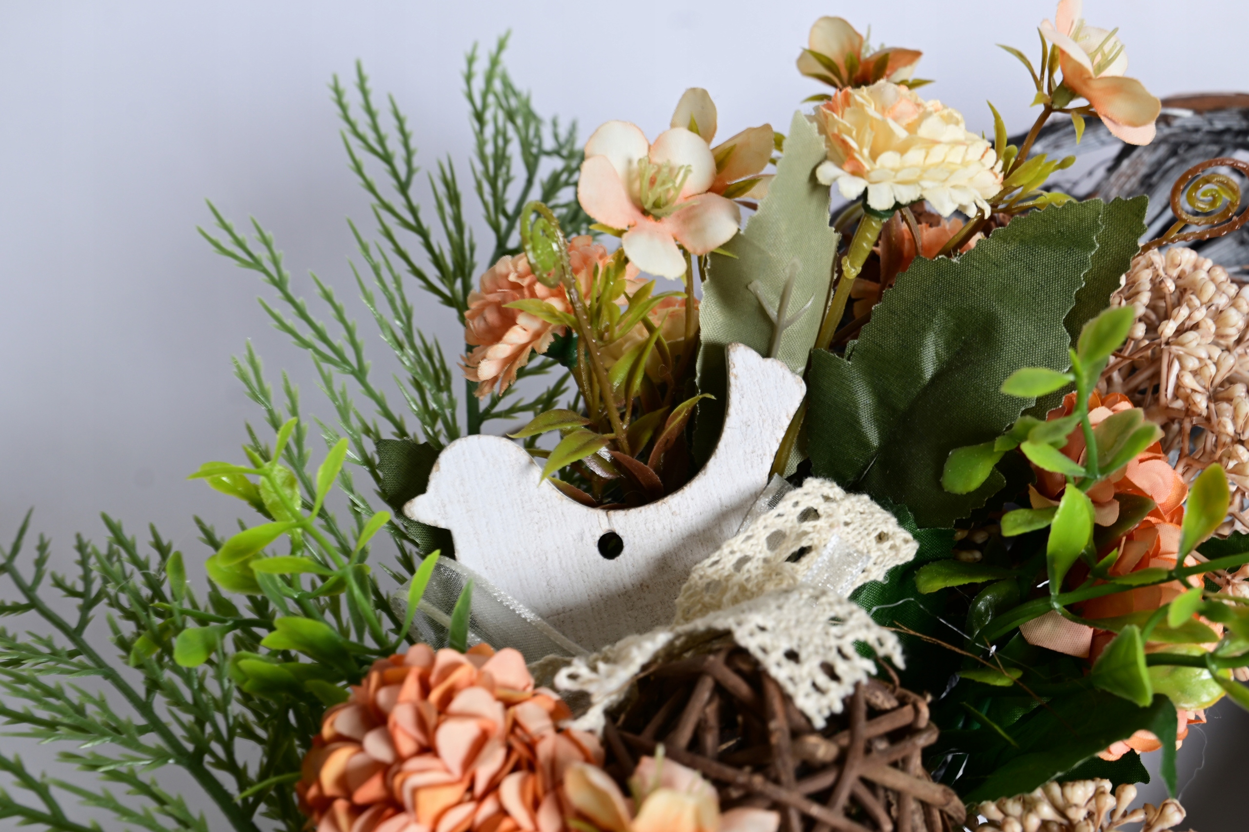 Необычный состав комбинации материала с искусственными цветами и деревянными аксессуарами!