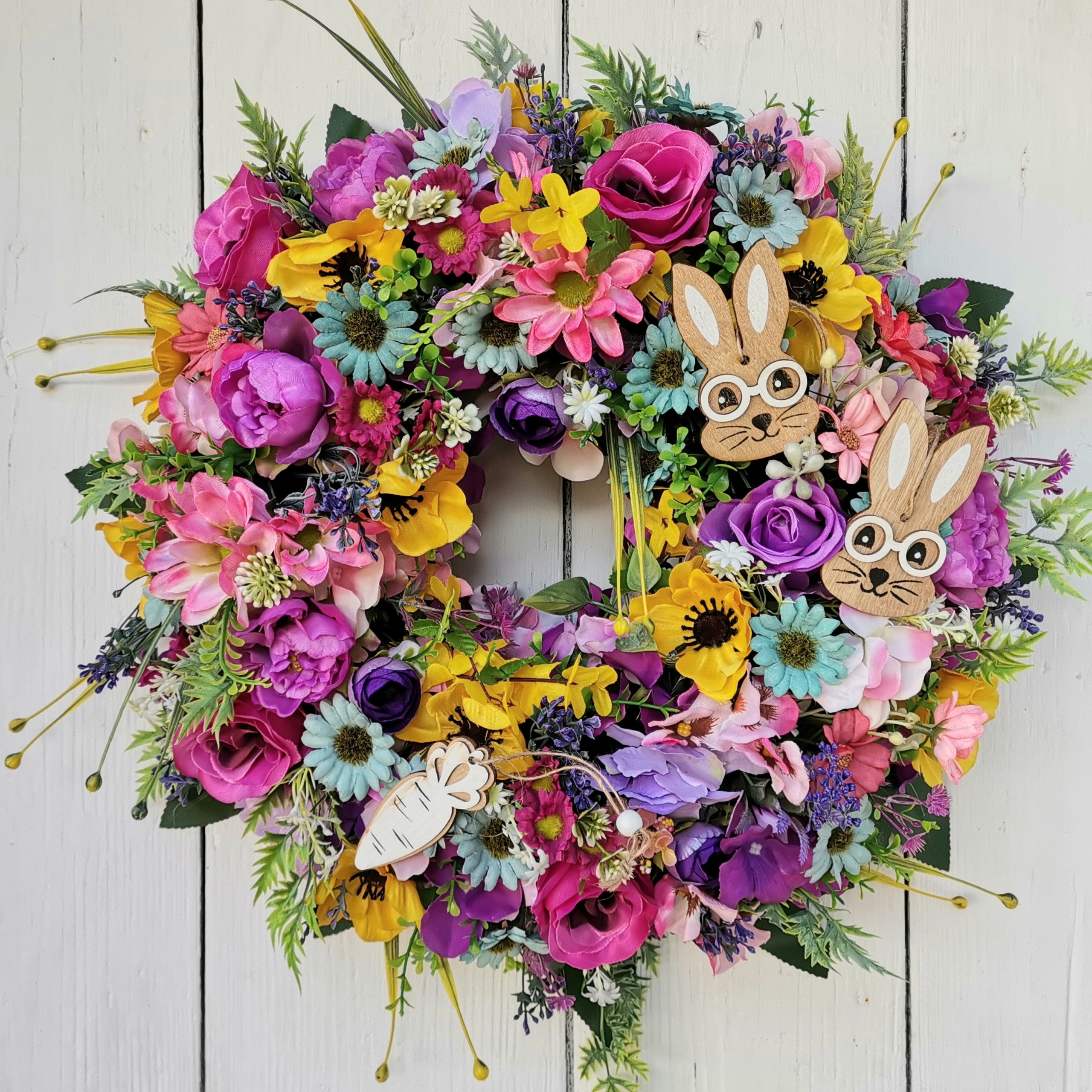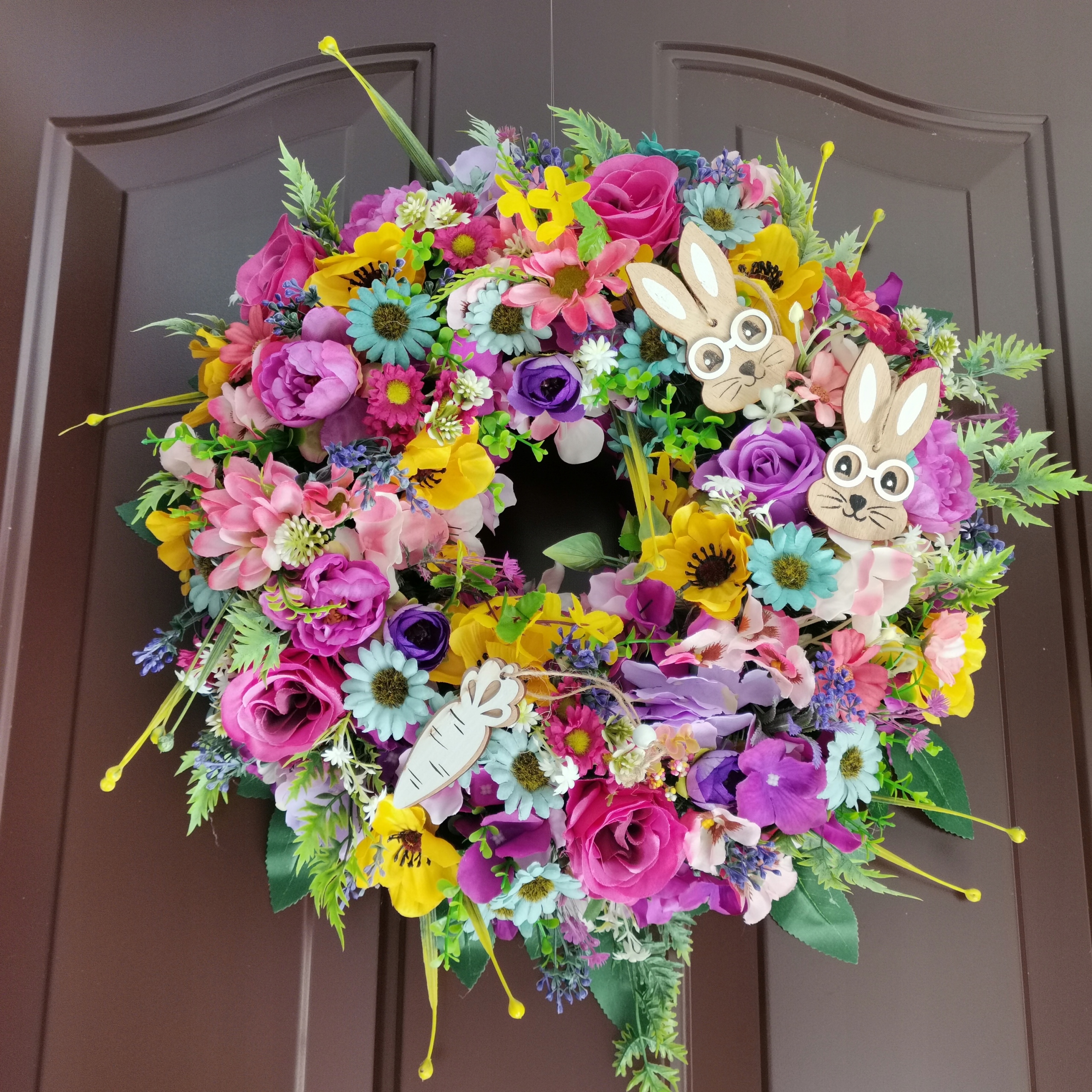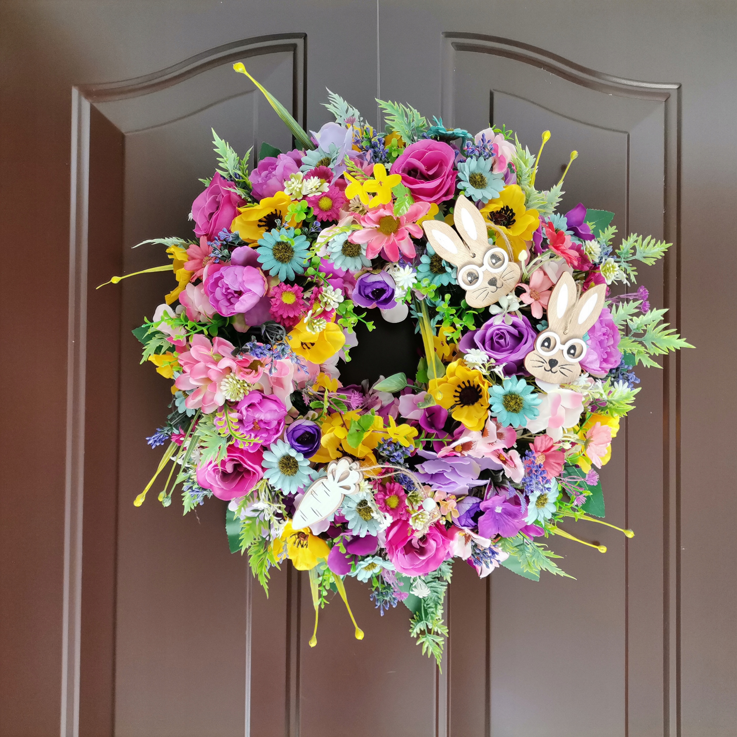 Весенний венок Пасха красочные кролики 40 см на двери цветов