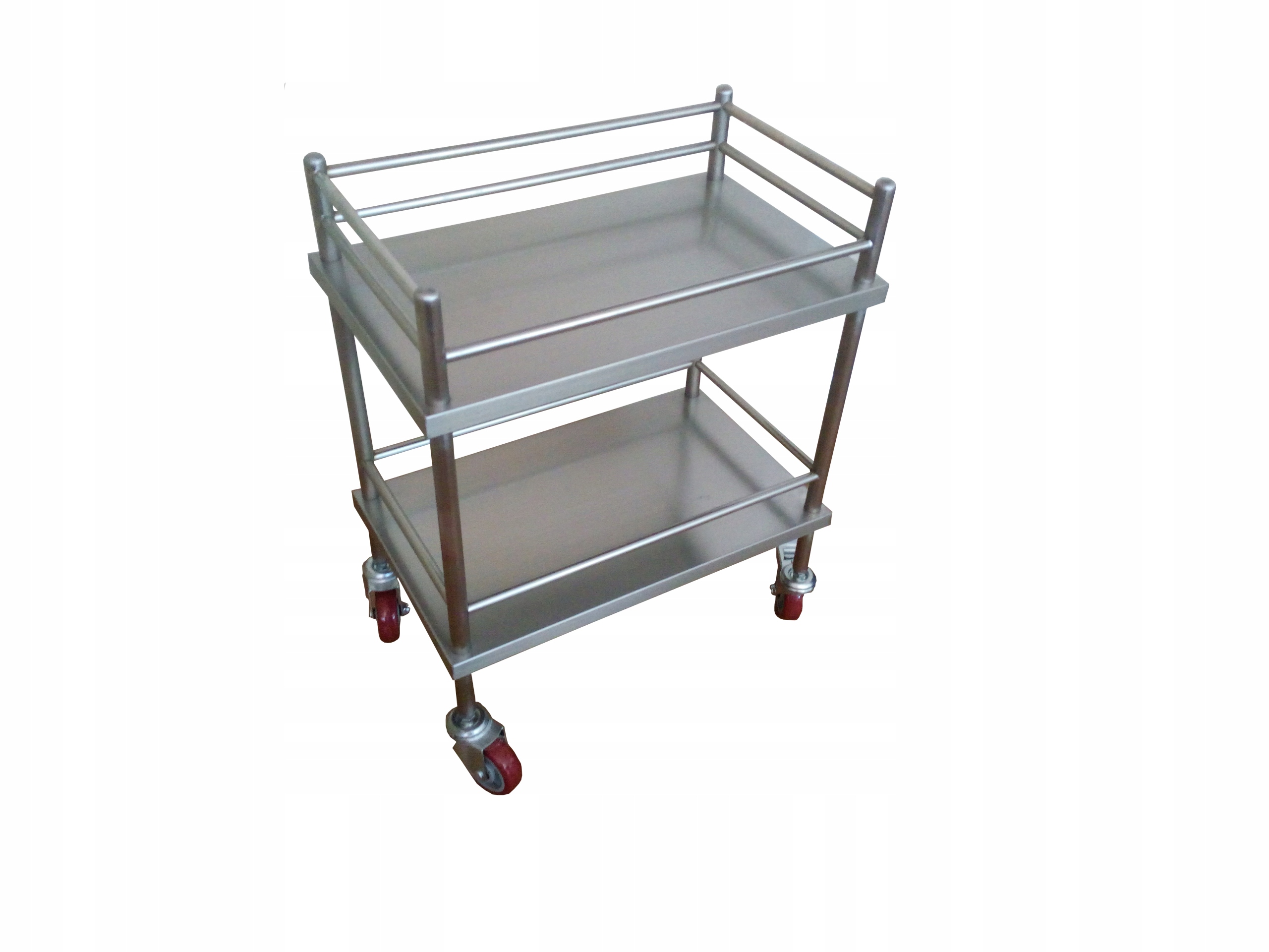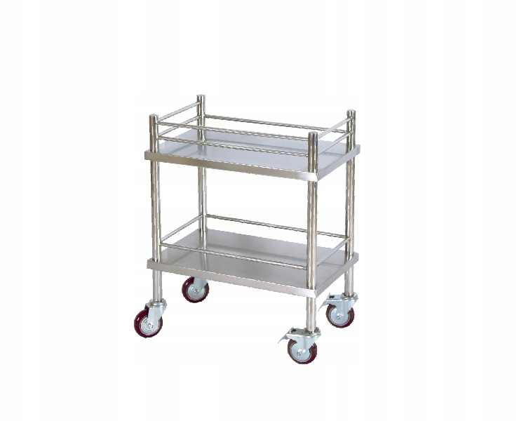 высококачественная нержавеющая сталь, две полки с защитным барьером, обрезиненные колеса с замками