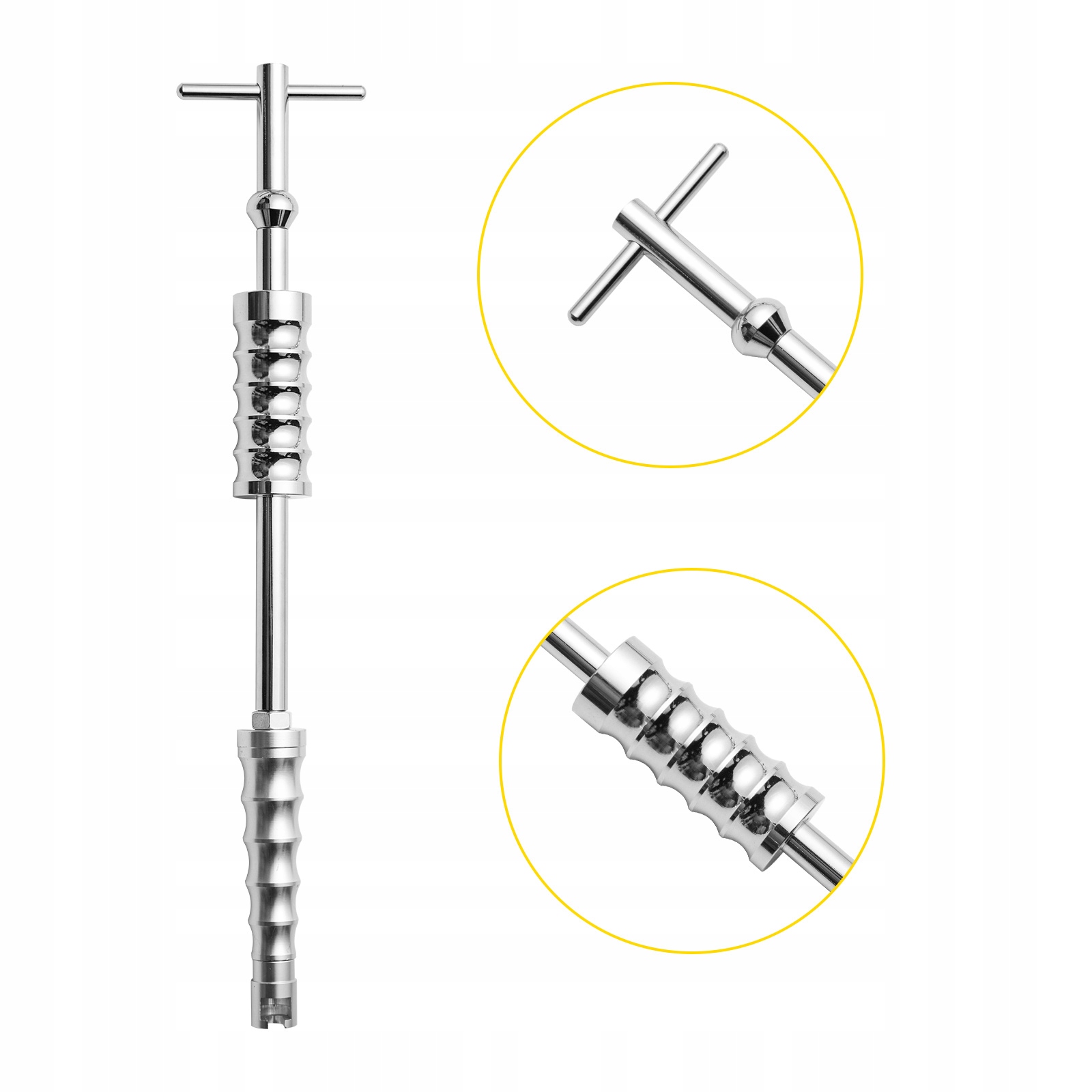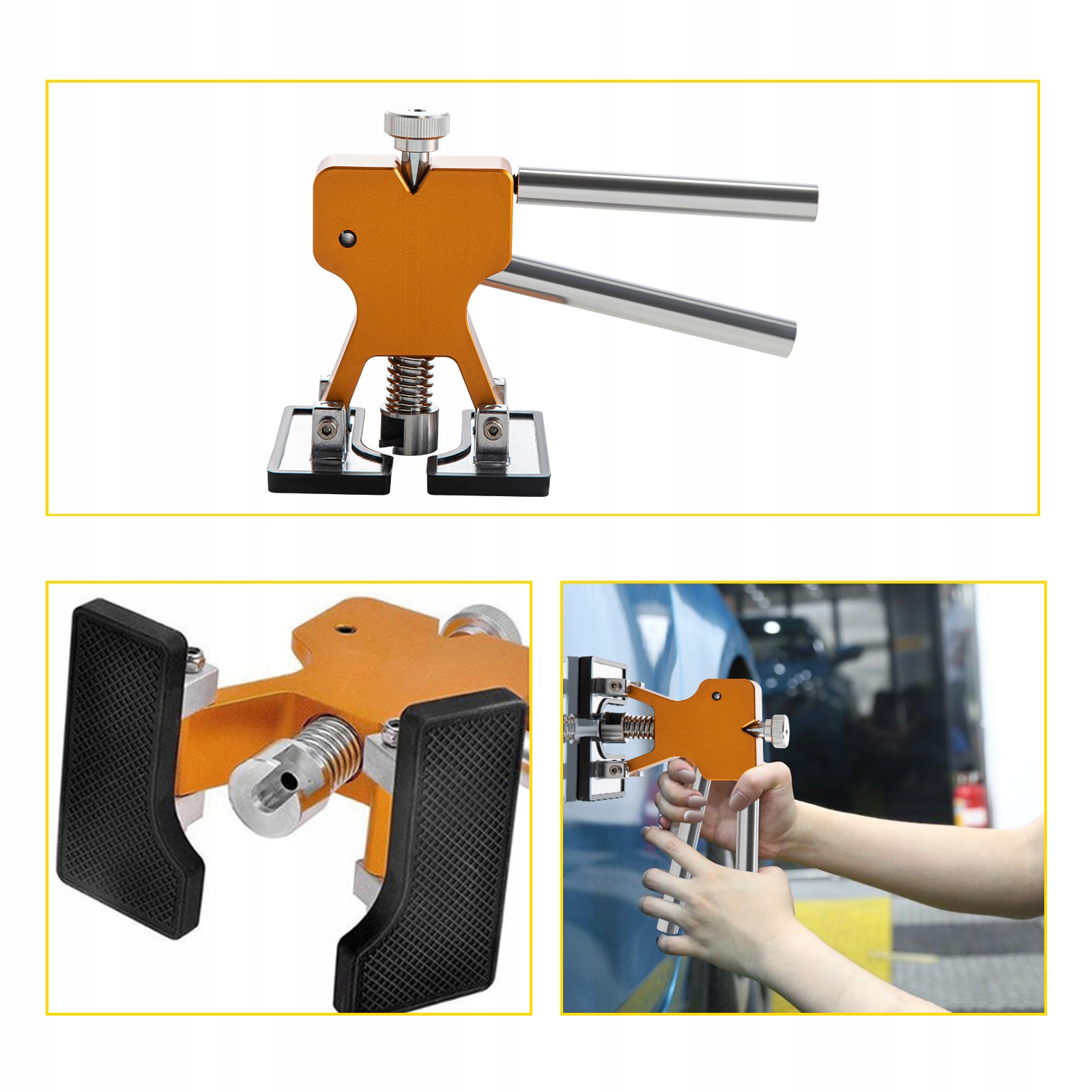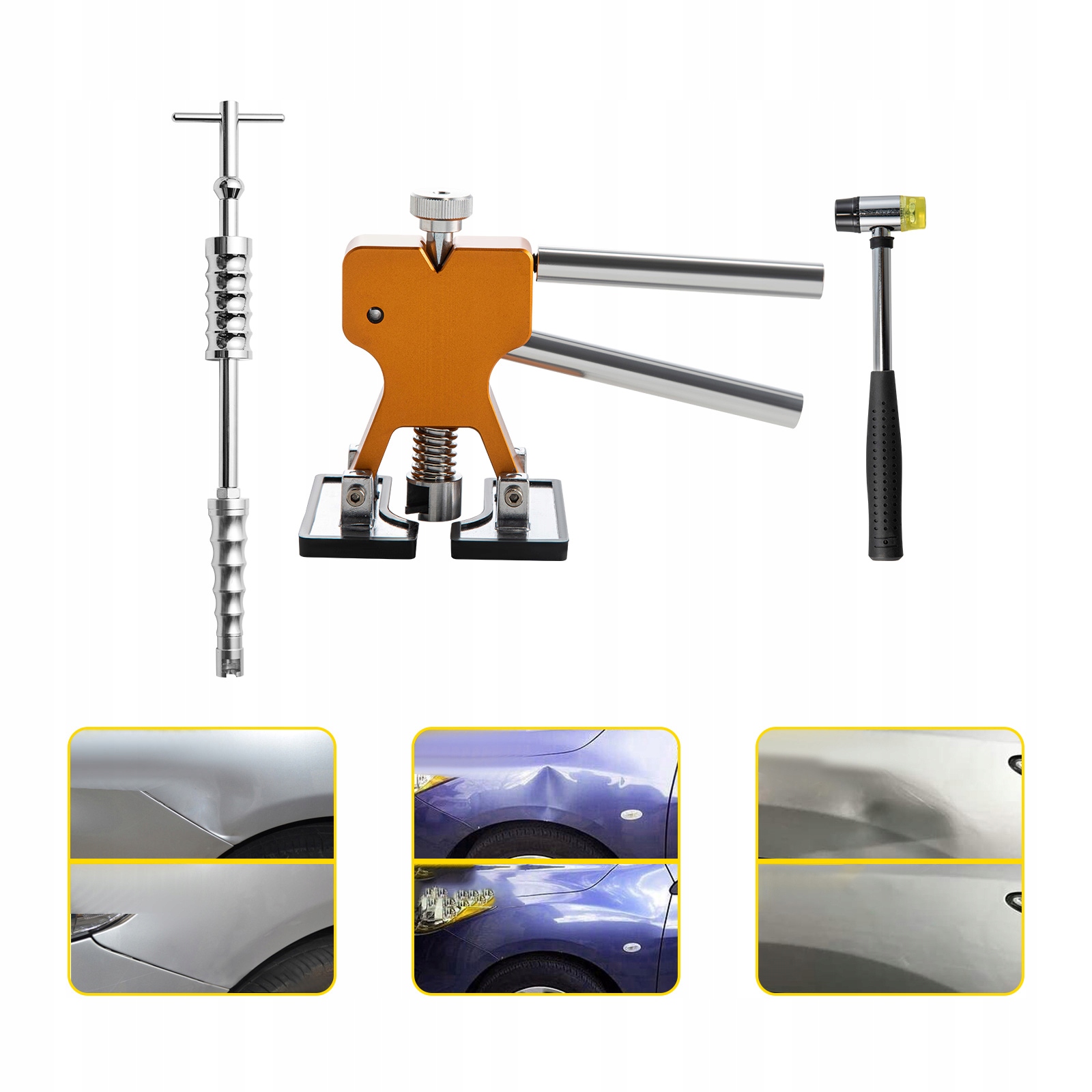 Вмятины Резиновый молоток: резиновый молоток используется для ремонта небольших вмятин неправильной формы. Этот молоток поможет быстро отремонтировать вмятины на кузове. Желтая головка молоточка мягкая и полупрозрачная. Молоток имеет высококачественную стальную ручку с эргономичным дизайном, удобен, подходит для длительного использования.