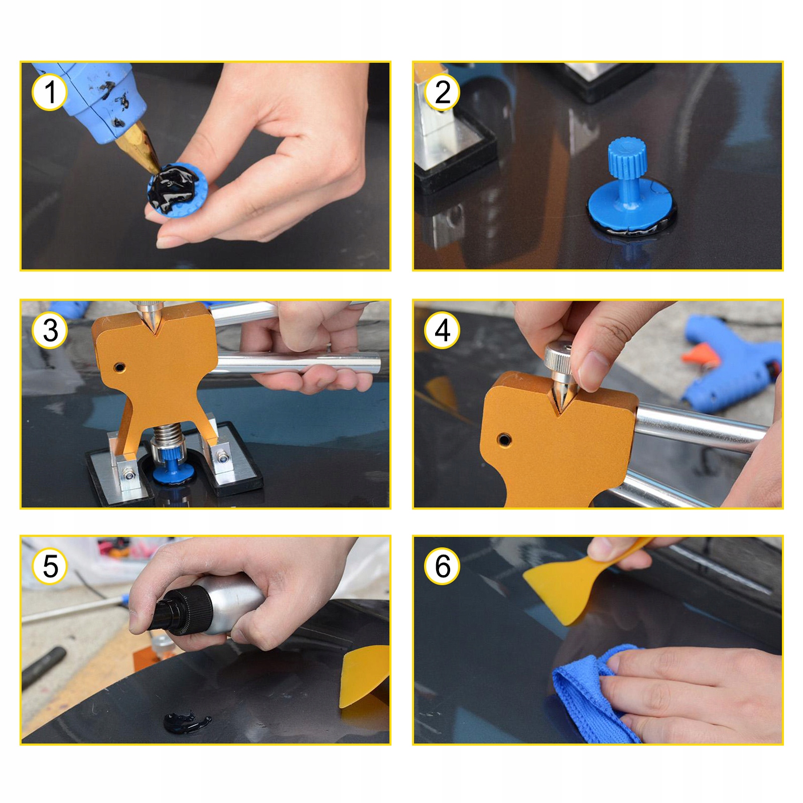 Комплект для ремонта вмятин не повреждает оригинальную краску кузова. Эффективно устраняет вмятины, образовавшиеся от града, ударов и т. д. Этот инструмент для удаления вмятин не только работает на всех типах автомобилей, но также отлично подходит для ремонта вмятин на металлических поверхностях.