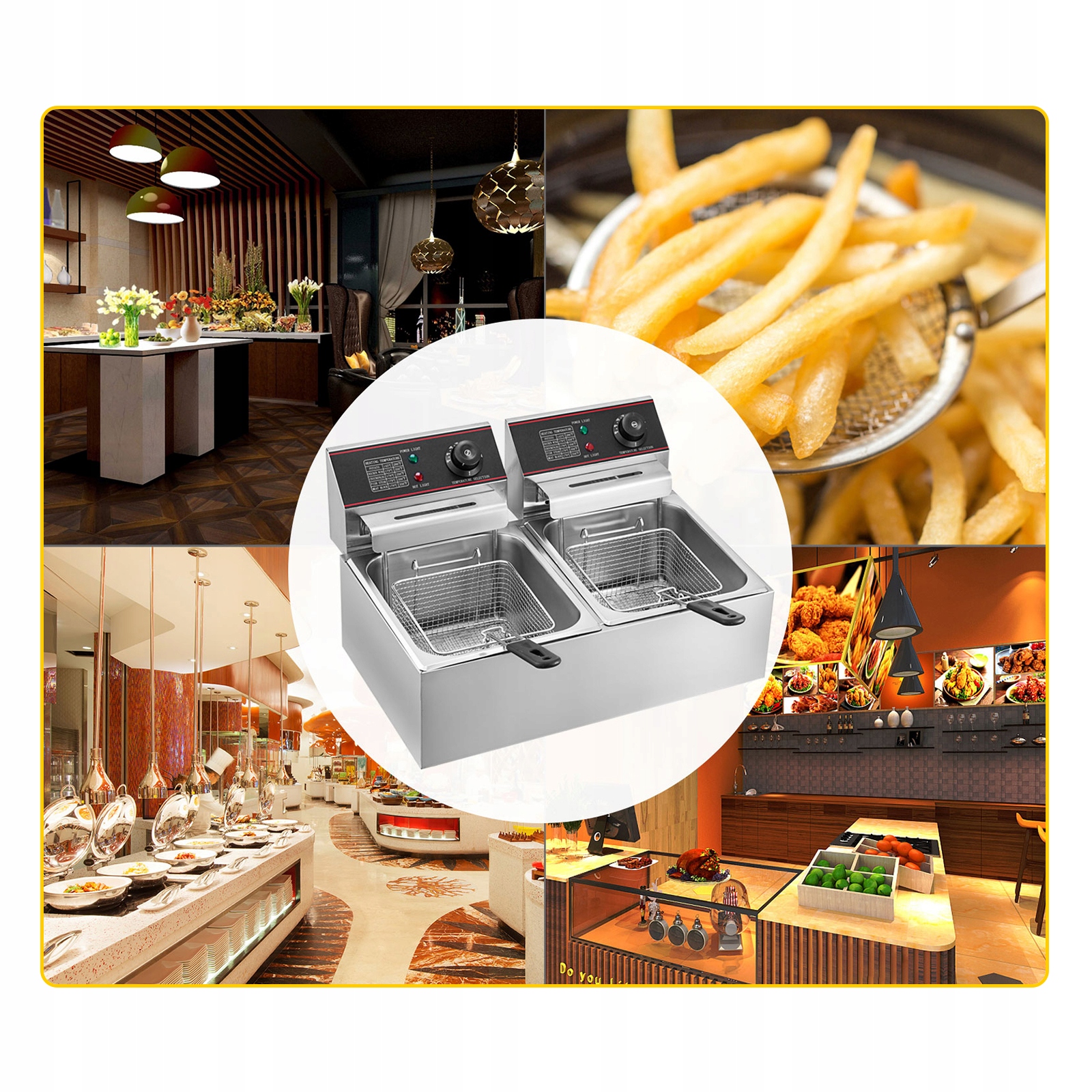 Независимый контроль для каждого резервуара. Регулируемая температура 50~200℃. Индикаторы питания и обогрева указывают на рабочее состояние. Наклейка с рекомендуемой температурой приготовления различных блюд.