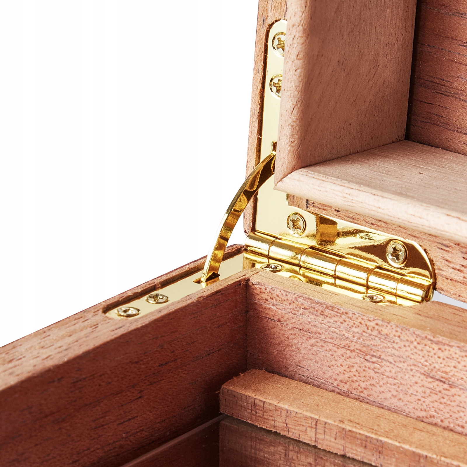 Береговая полоска удерживает влагу, создавая идеальную среду для увлажнения и выдержки сигар. Петли из нержавеющей стали долговечны и устойчивы, благодаря чему ящик легко открывается и закрывается, что позволяет использовать его дольше и надежнее.