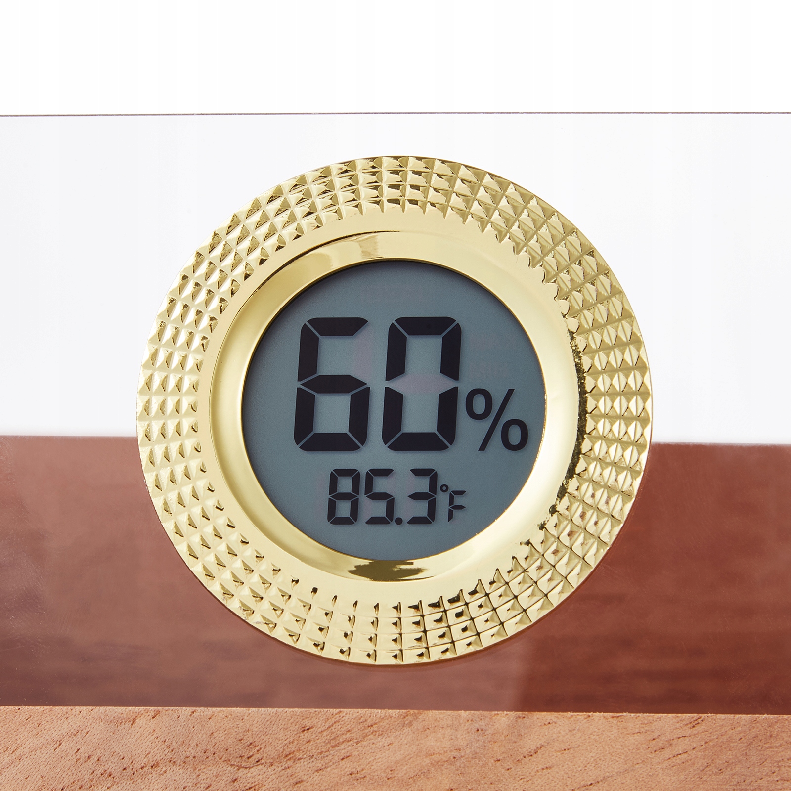 Оснащен точным гигрометром, в случае отсутствия влажности вы можете просто добавить в увлажнитель увлажнитель для сигар или дистиллированную воду, чтобы поддерживать влажность в коробке, избегая тем самым потеря вкуса из-за низкой влажности, а также плесень и насекомые из-за высокой влажности.