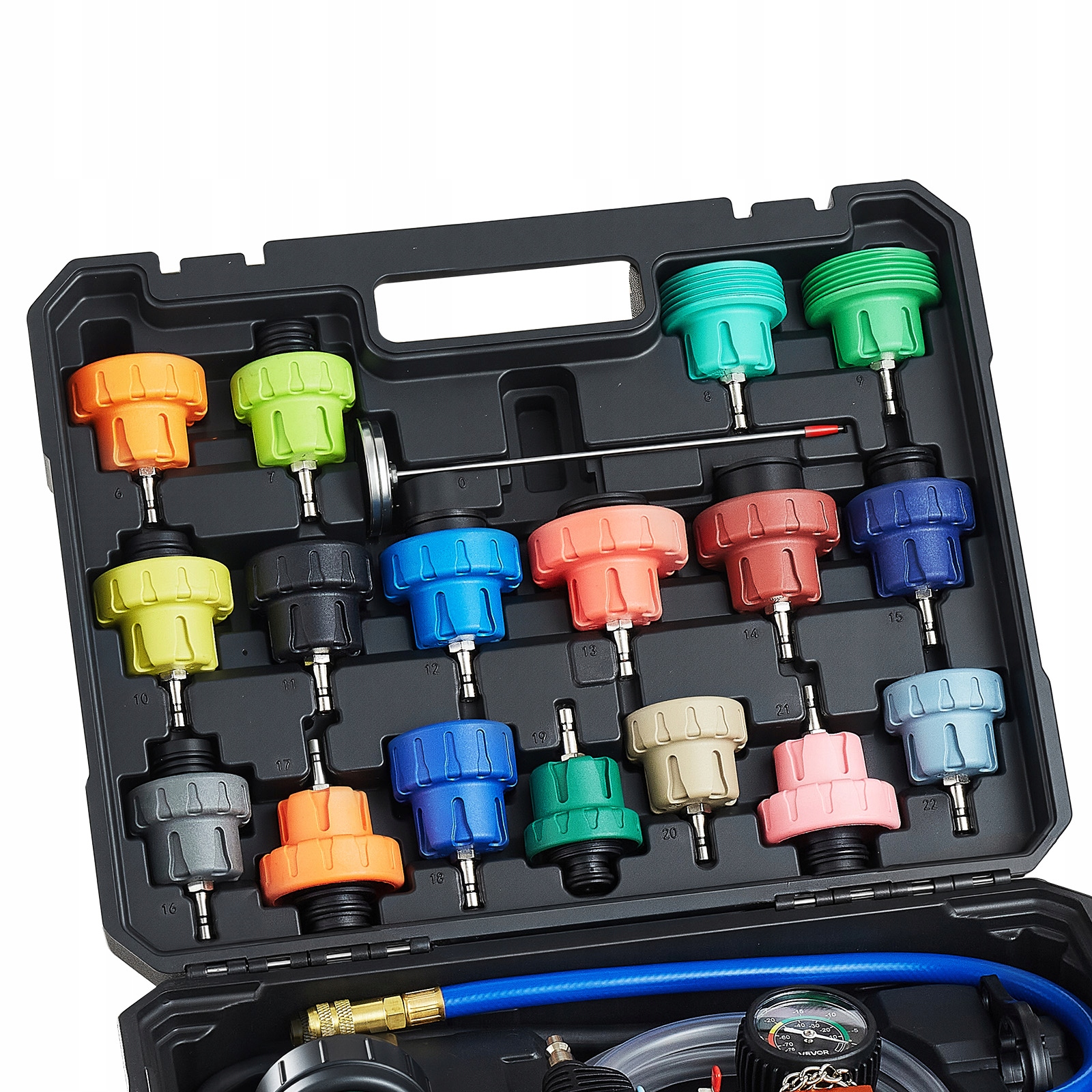 Удлинительный комплект для измерения давления охлаждающей жидкости: этот комплект из 47 предметов для проверки давления охлаждающей жидкости включает в себя нагнетательный насос, вакуум и инструмент для заливки охлаждающей жидкости, металлические адаптеры, цветные контрольные колпачки и универсальный конический адаптер. Комплексное решение для обнаружения утечек, температурных испытаний и дозаправки жидкости.