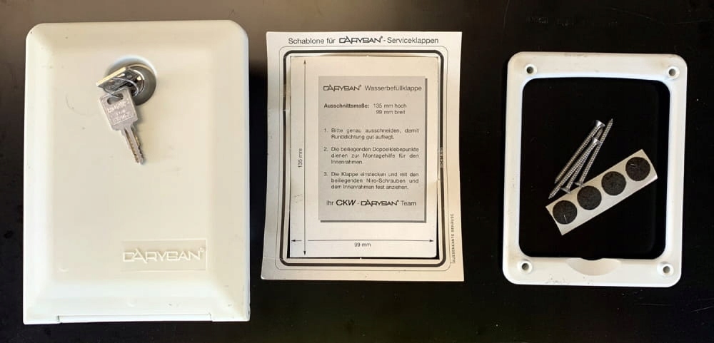 Сборка: Сервисные заслонки легко устанавливаются. Вырежьте отверстие в стенке прицепа согласно предоставленному шаблону и заклейте бутиловым герметиком Dekaseal 8936. Винты включены. Размеры выреза 135 х 99 мм.