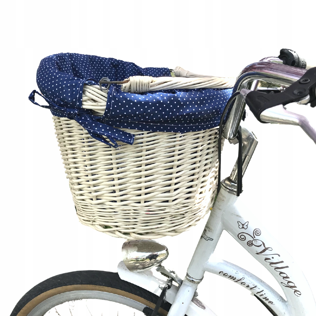 Плетеная велосипедная корзина на руль беленая + темно-синяя вставка в горошек