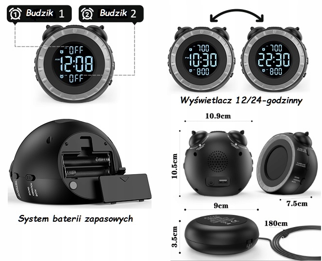 Особые характеристики: повтор, регулируемая яркость, двойной звуковой сигнал, регулируемая громкость, порт для зарядки.